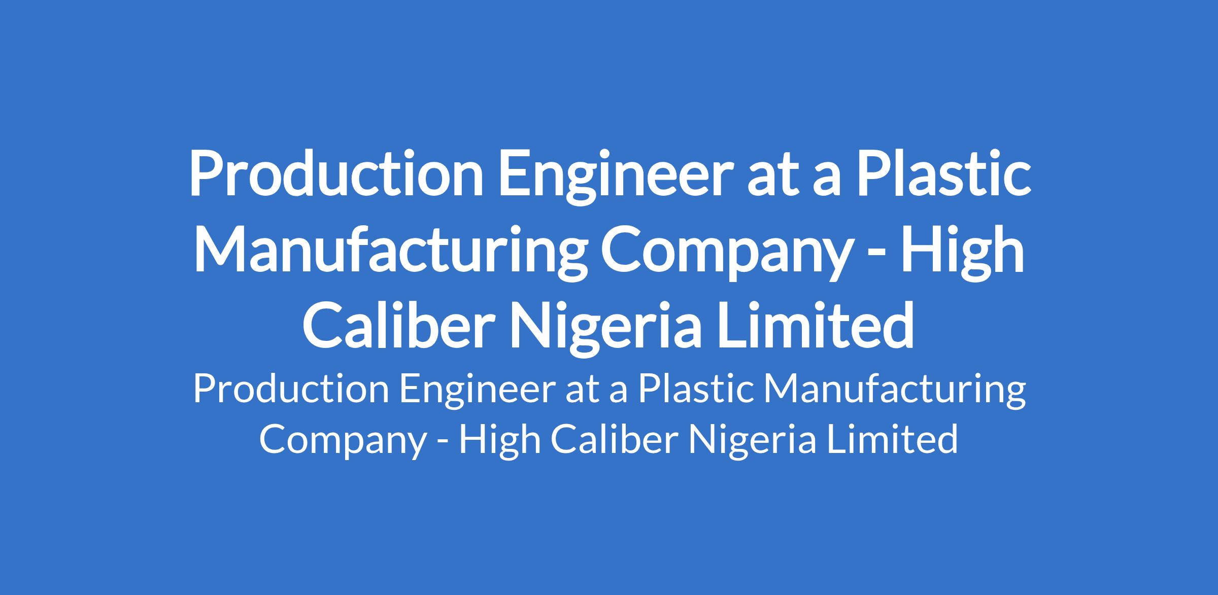 High Caliber Nigeria Limited - Our client, a Plastic manufacturing company is recruiting to fill the position of: Production Engineer. The position is located in Amuwo Odofin, Lagos State. Interested candidates should possess an HND / B.Sc Degree in Mechanical Engineering with a minimum of 4 years working on an injection molding machine or plastic machine.