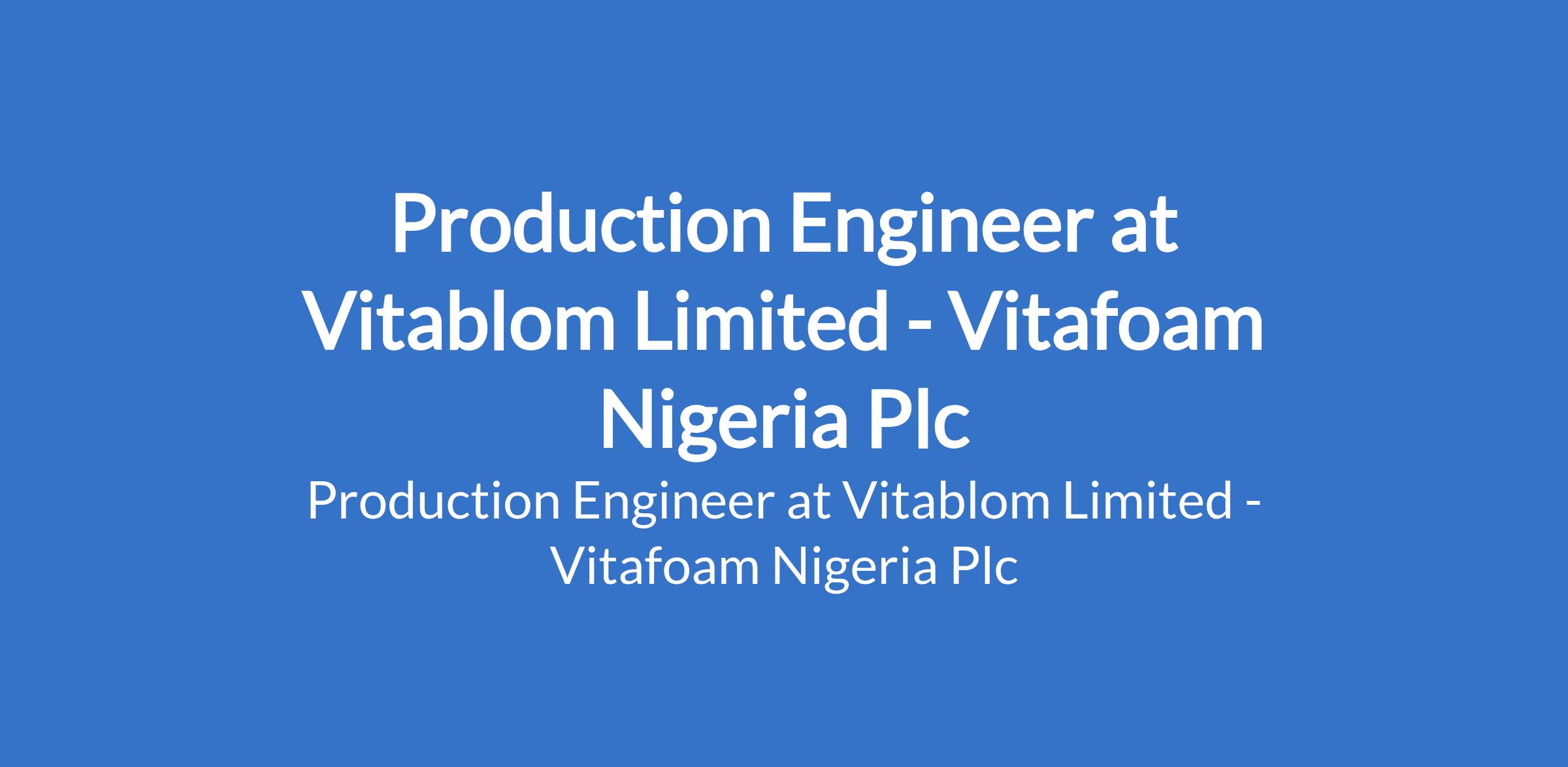 Vitablom Limited, a subsidiary of Vitafoam Nigeria Plc is recruiting to fill the position of: Production Engineer. The position is located in Ikeja, Lagos State. Interested candidates should possess a Bachelors Degree in Mechanical Engineering with 35 years experience as a Production Engineer, preferably in the foam manufacturing or related industry.