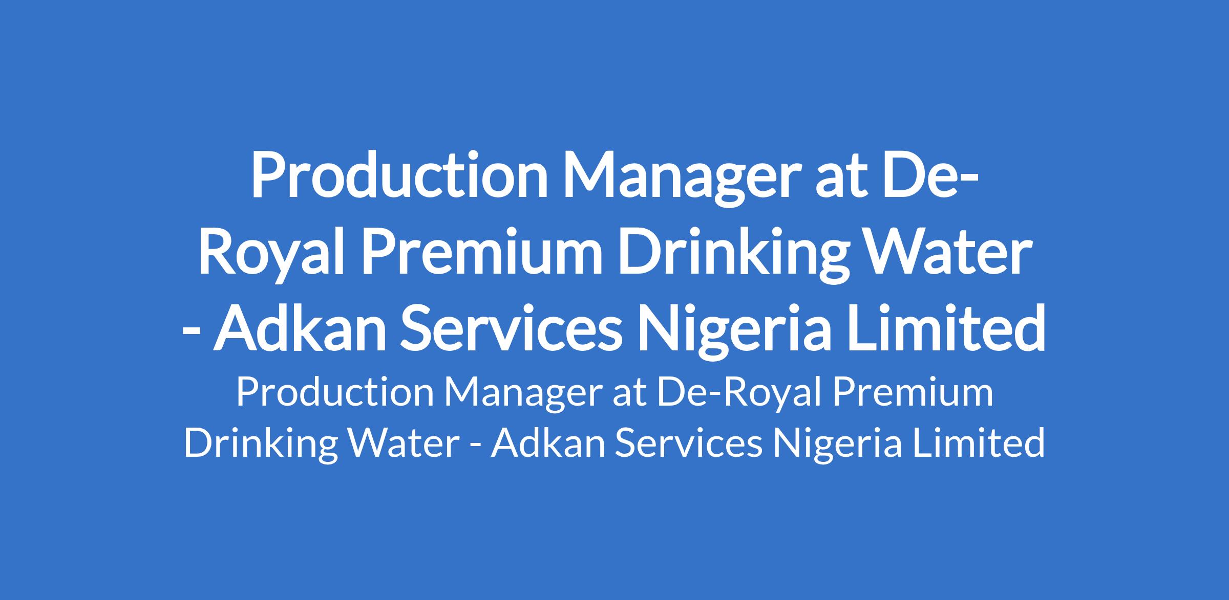 Adkan Services Nigeria Limited - Our sister company, De-Royal Premium Drinking Water is recruiting to fill the position of: Production Manager. The position is located in Abuja (FCT). The successful candidate will ensure efficient production, maintain high-quality standards, and drive continuous improvement while ensuring full compliance with regulatory and safety requirements. Interested candidates should possess a Bachelors Degree or HND in Industrial Engineering, Mechanical Engineering, Chemical Engineering, Food Science/Technology or other related fields with 58 years experience in manufacturing/production