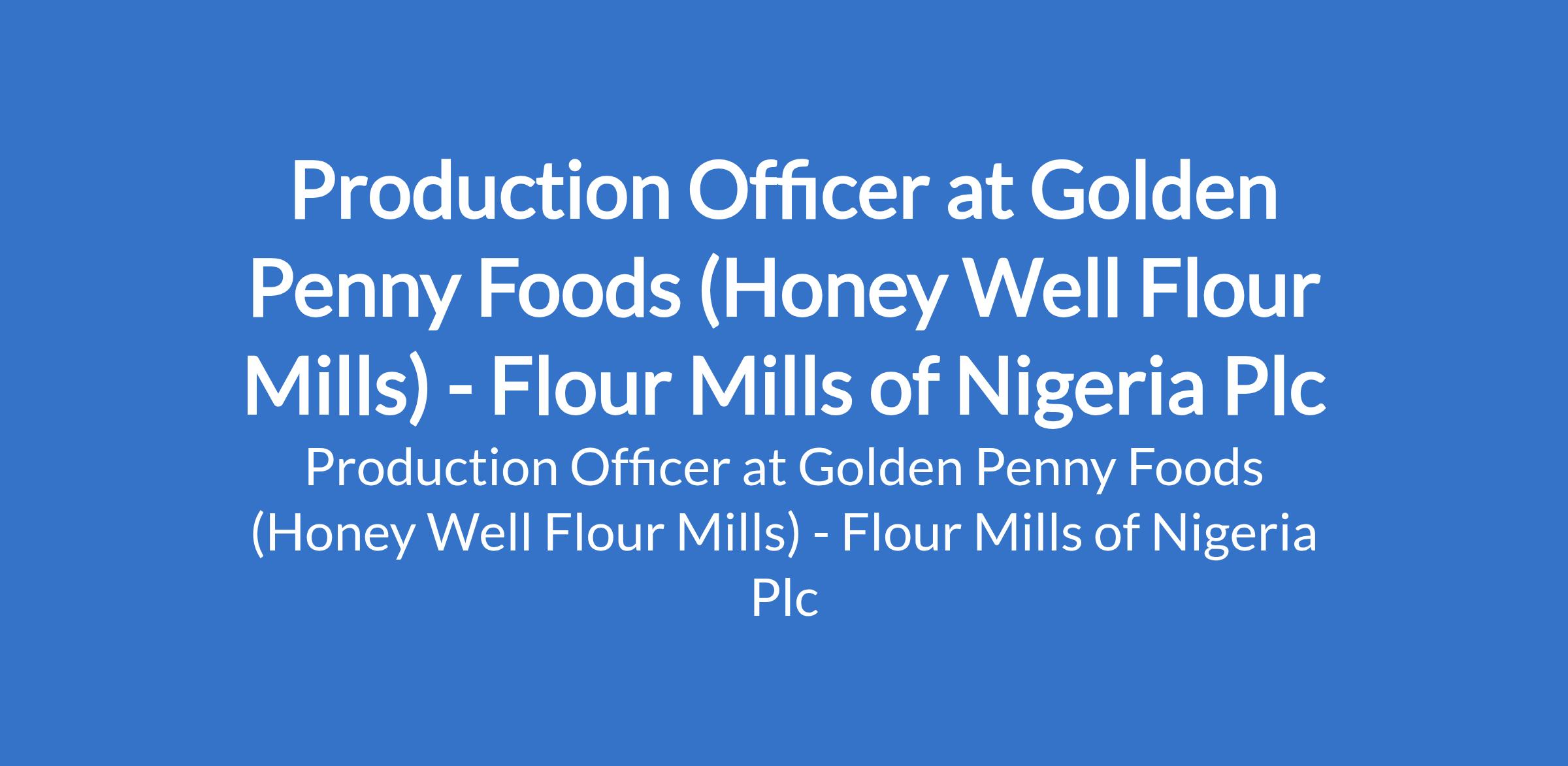 Golden Penny Foods (Honey Well Flour Mills), a subsidiary of Flour Mills of Nigeria Plc is recruiting to fill the position of: Production Officer. The position is located in Sagamu, Ogun State. Interested candidates should possess an HND or Bachelors Degree in Mechanical Engineering, Electrical Engineering, Food Technology, Industrial Technology, Chemical Engineering, or a related field with a minimum of 3 years experience in a manufacturing or FMCG production environment, preferably in production line operations or supervision.