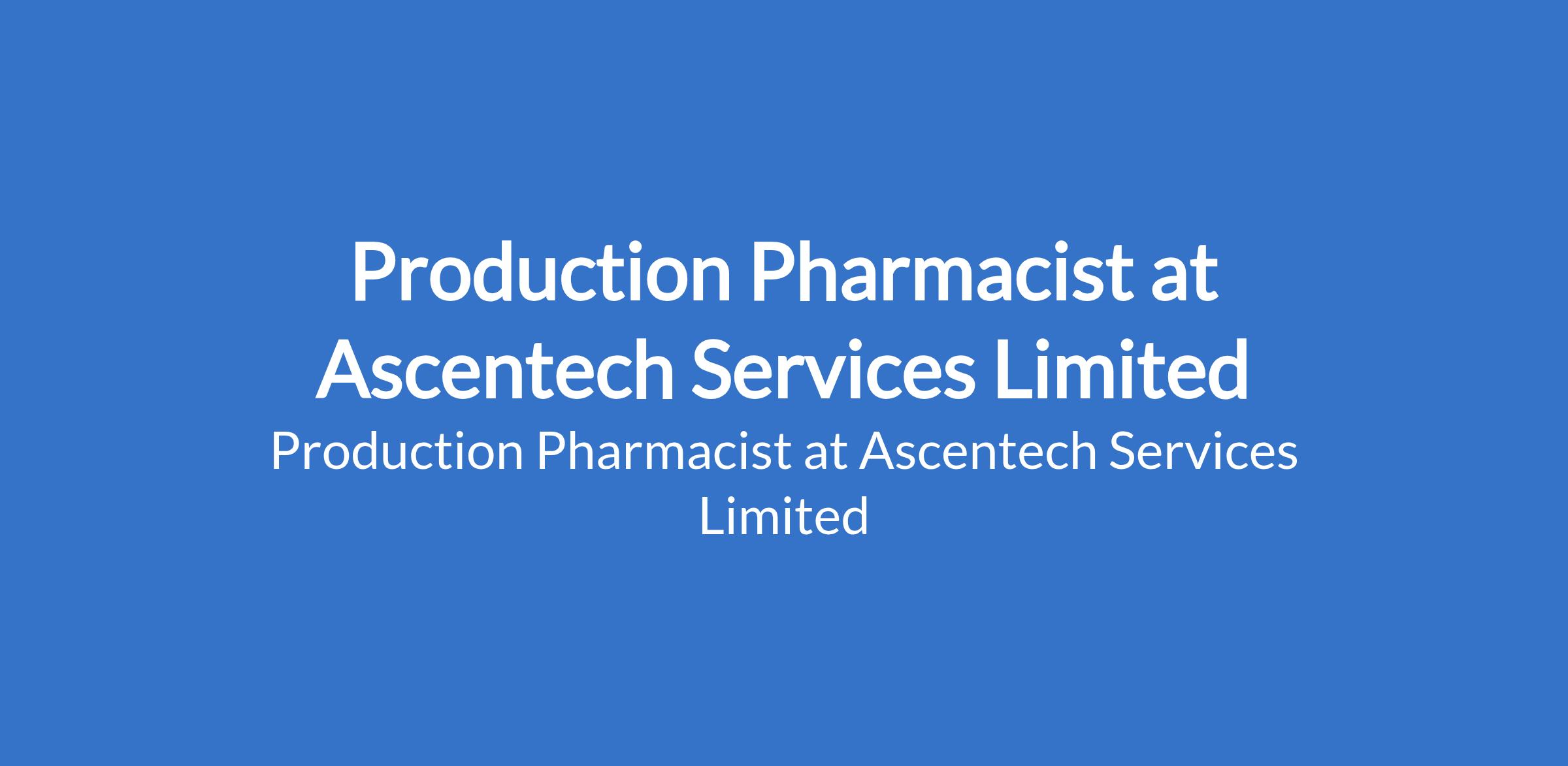 Ascentech Services Limited is recruiting to fill the position of: Production Pharmacist. The position is located in Ota, Ogun State. Interested candidates should possess a B.Pharm or Pharm.D. (Full PCN registration) with 2 3 years experience in a NAFDAC - approved pharmaceutical manufacturing facility.