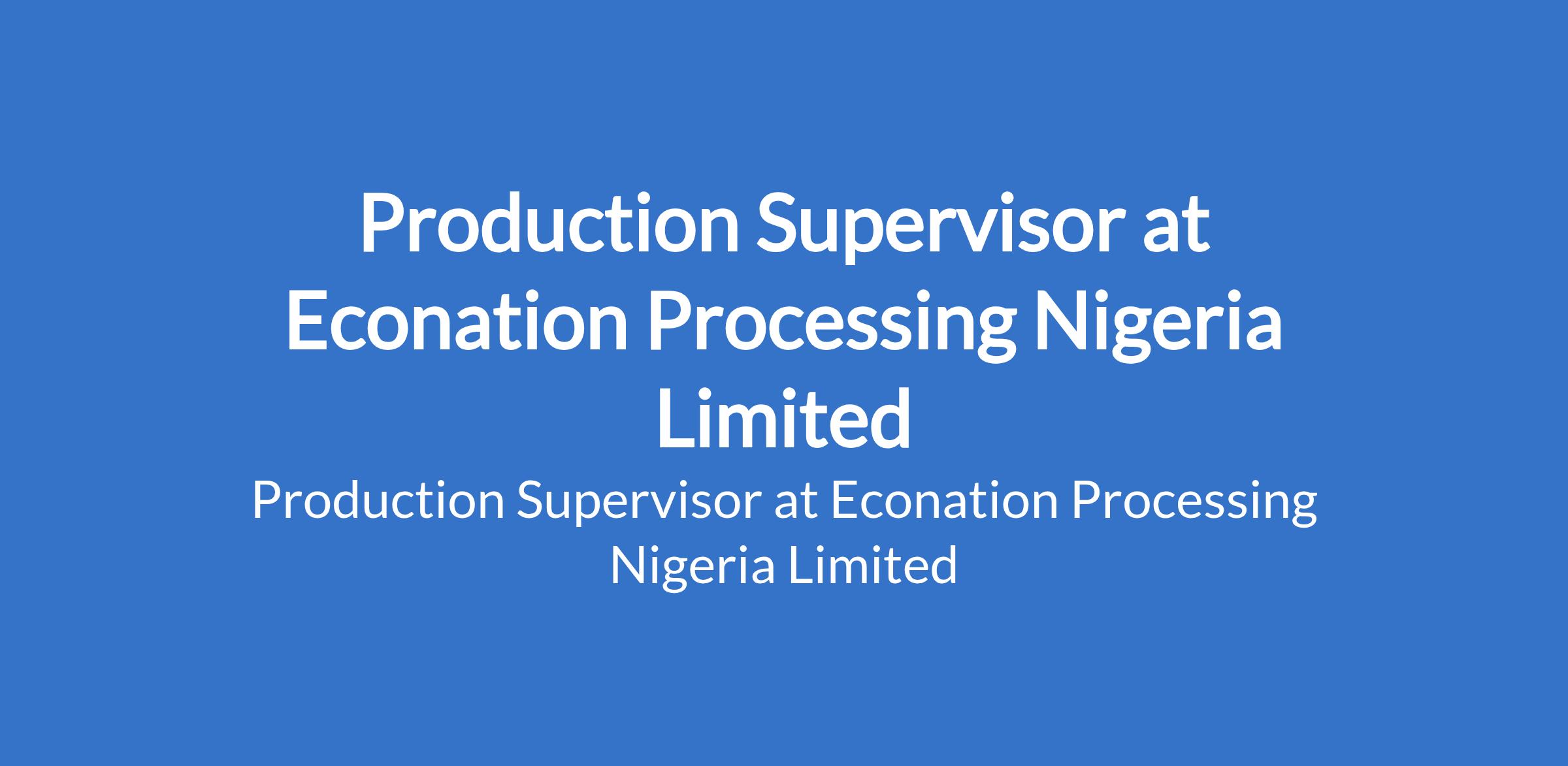 Econation Processing Nigeria Limited is recruiting to fill the position of: Production Supervisor. The position is located in Uyo, Akwa Ibom State. Salary: N100,00 - N150,000 monthly. Interested candidates should possess a Bachelor's Degree in Electrical /Mechanical Engineering with 3 years of work experience in production.