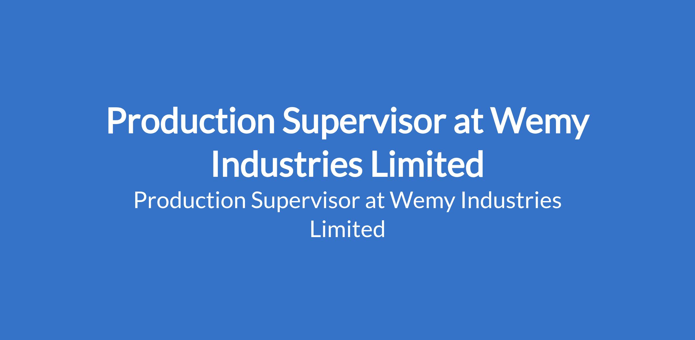 Wemy Industries Limited is recruiting to fill the position of: Production Supervisor. The position is located in Ketu, Lagos State. Interested candidates should possess an HND / B.Sc Degree in Engineering, Industrial Management, or related field with 3 5 years of experience in FMCG manufacturing; diaper or hygiene product experience is an advantage.