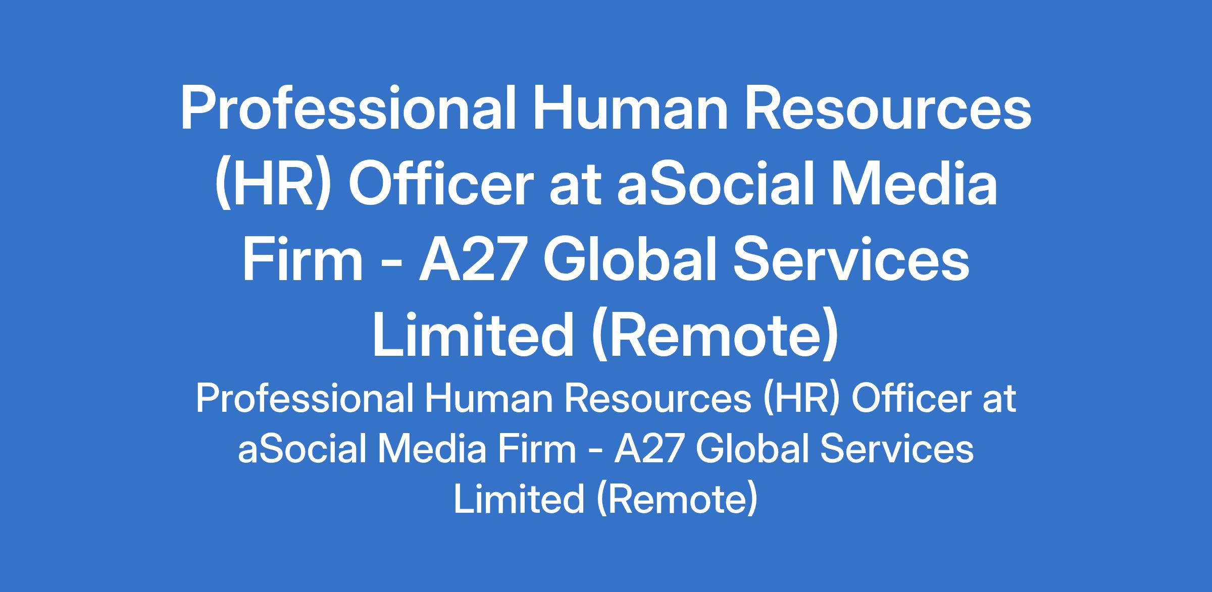 A27 Global Services Limited - Our client, aSocial Media firm is recruiting to fill the position of: Professional Human Resources (HR) Officer. The position is located in Lagos State. Salary: N150,000 - N200,000 Monthly. Interested candidates should possess a Bachelor's Degree in Human Resources, Business Administration, or a related field; Professional HR certification (e.g., CIPM, SHRM, HRCI) is an added advantage with proven experience as an HR professional, preferably in a remote or hybrid environment.