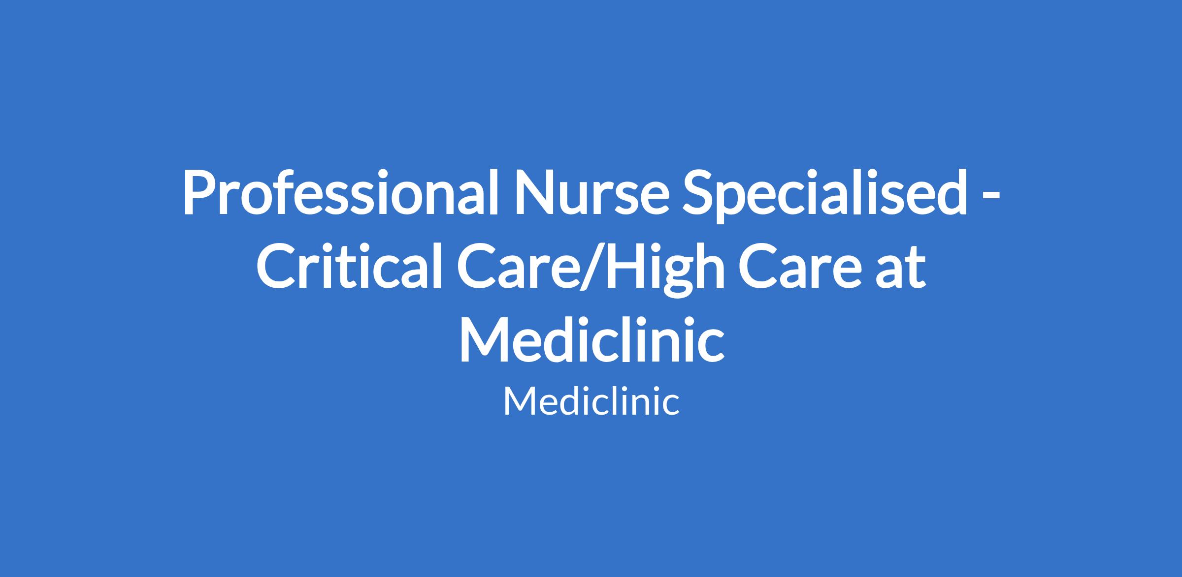 Professional Nurse Specialised - Critical Care/High Care at Mediclinic