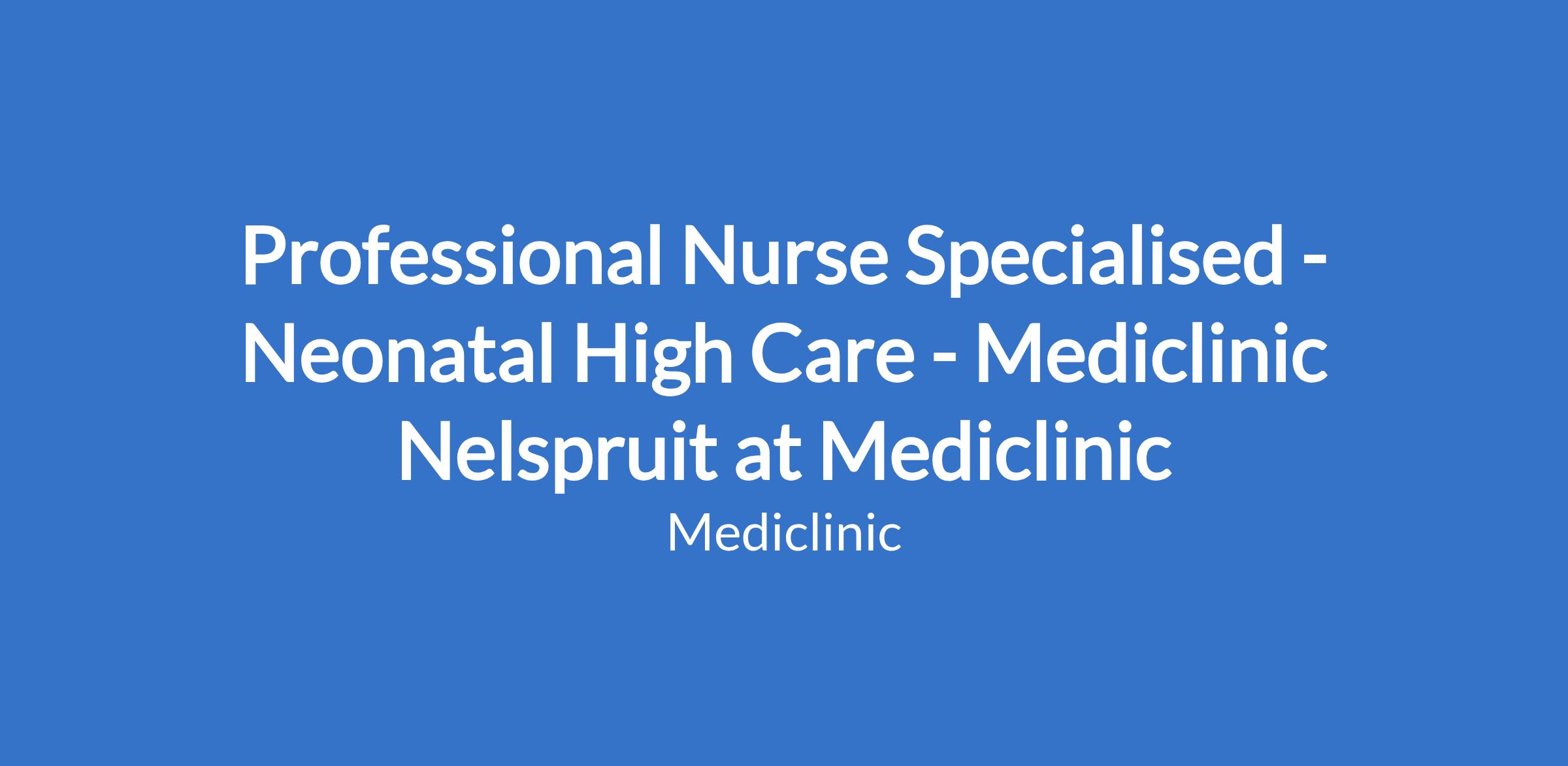 Professional Nurse Specialised - Neonatal High Care - Mediclinic Nelspruit at Mediclinic