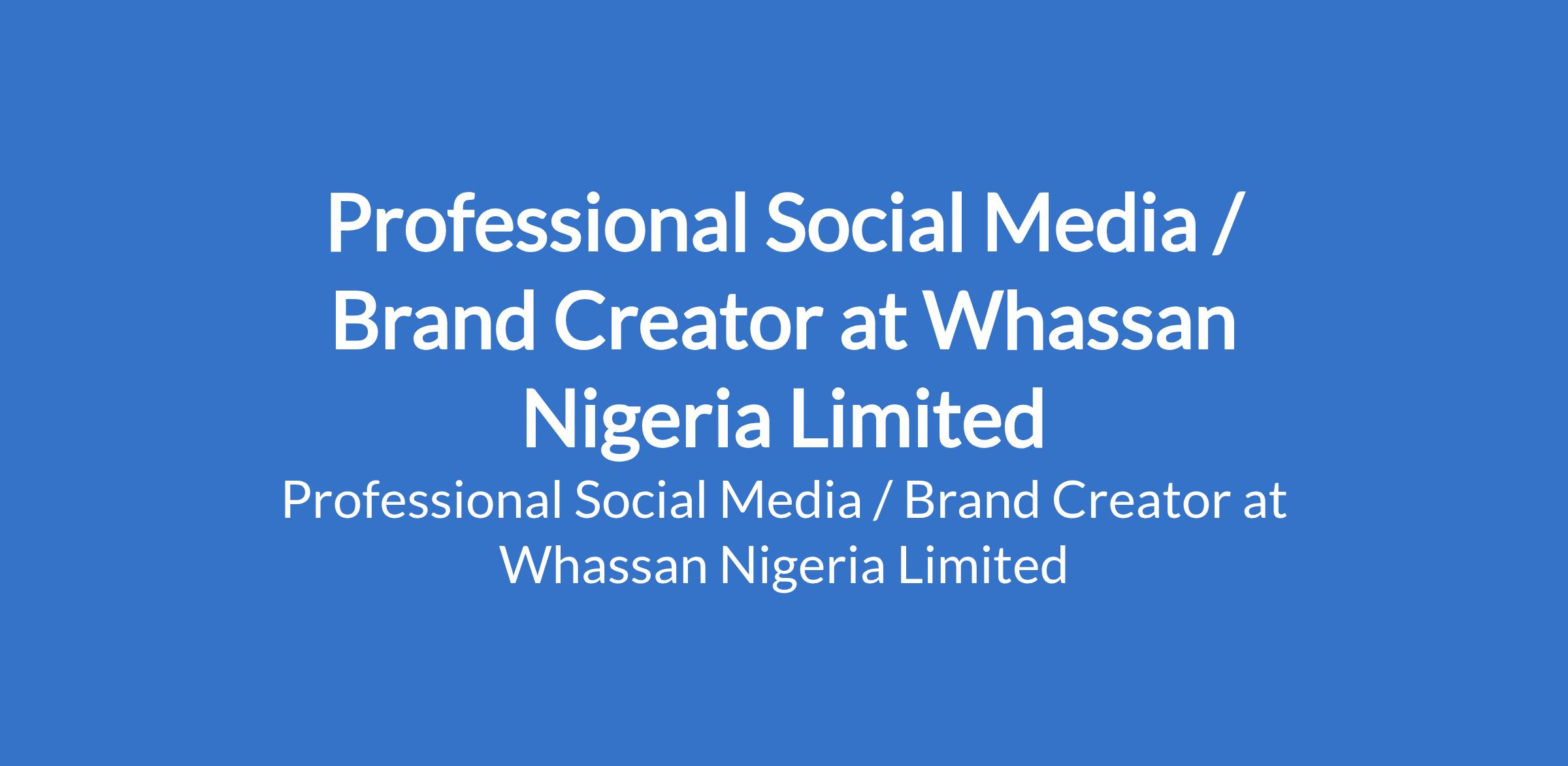 Whassan Nigeria Limited is recruiting to fill the position of: Professional Social Media / Brand Creator. The position is located in Victoria Island, Lagos State. Salary: N200,000 - N250,000 / month. Interested candidates should possess relevant qualifications.