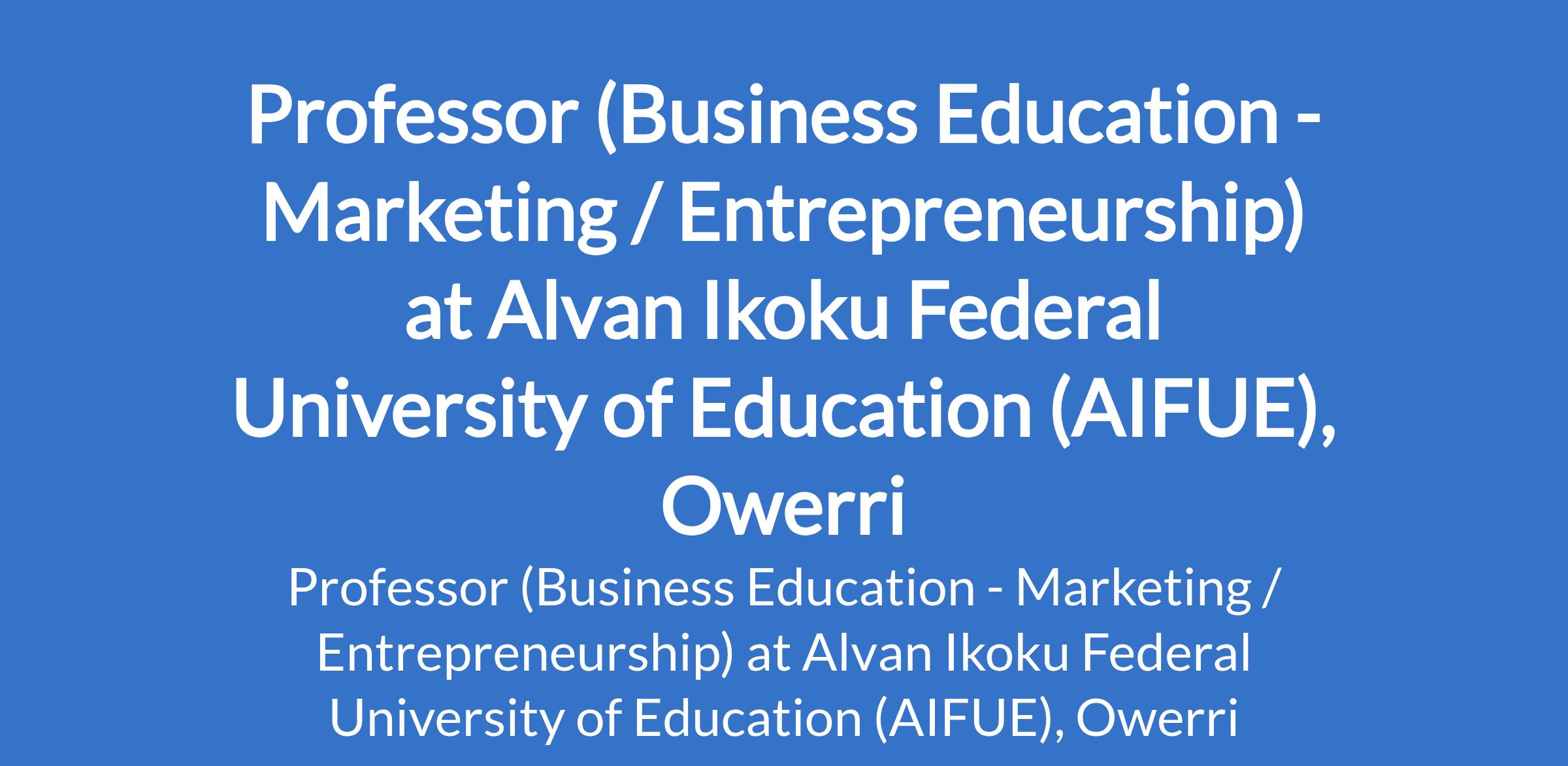 Alvan Ikoku Federal University of Education (AIFUE), Owerri invites applications from suitably qualified candidates for the position of: Professor (Business Education - Marketing / Entrepreneurship). The position is located in Imo State. Interested candidates should possess a PhD Degree in the relevant discipline with a minimum of three (3) years as Reader (Associate Professor) and fifteen (15) years of university teaching and research experience.