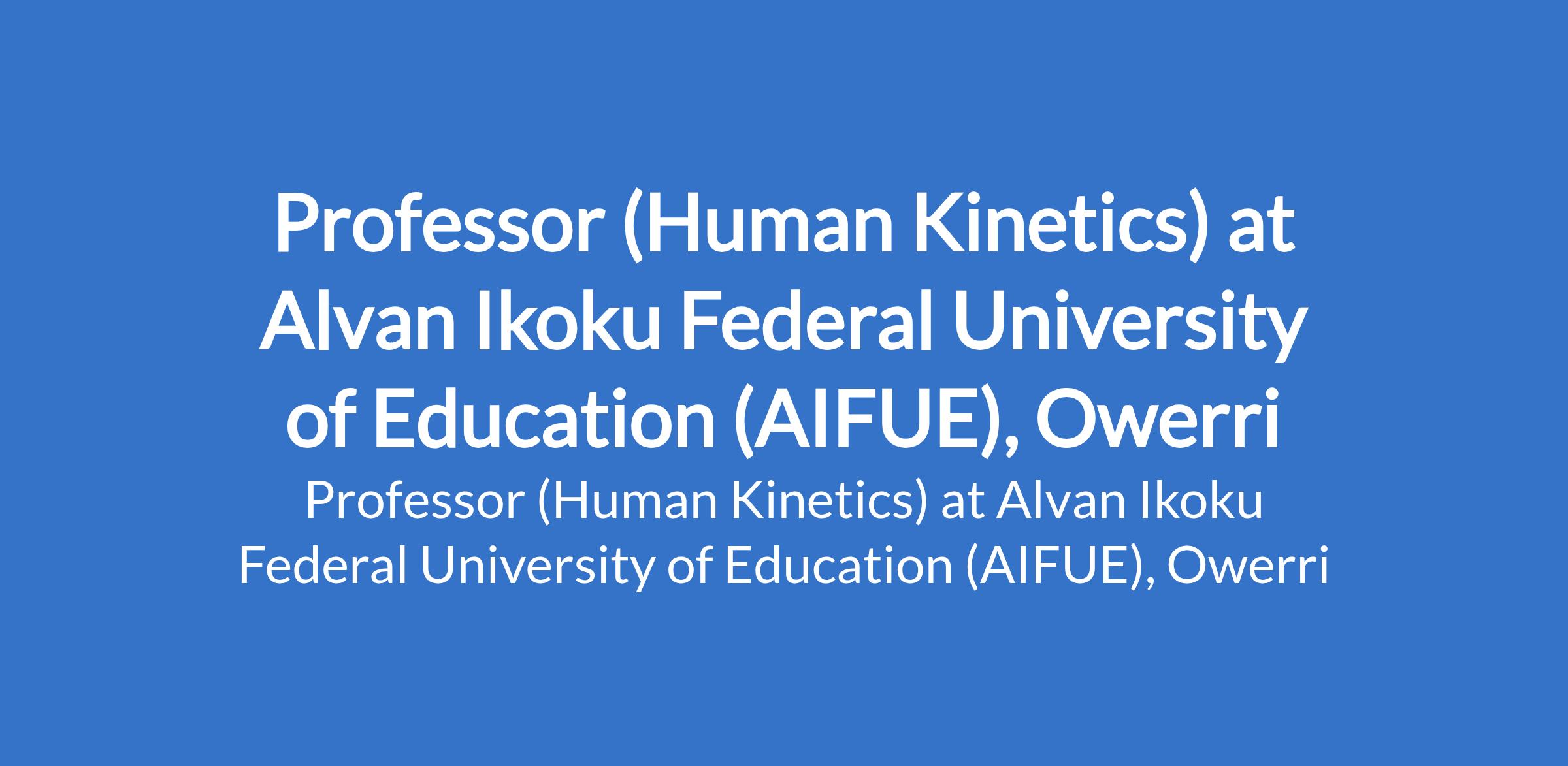 Alvan Ikoku Federal University of Education (AIFUE), Owerri invites applications from suitably qualified candidates for the position of: Professor (Human Kinetic). The position is located in Imo State. Interested candidates should possess a PhD Degree in the relevant discipline with a minimum of three (3) years as Reader (Associate Professor) and fifteen (15) years of university teaching and research experience.