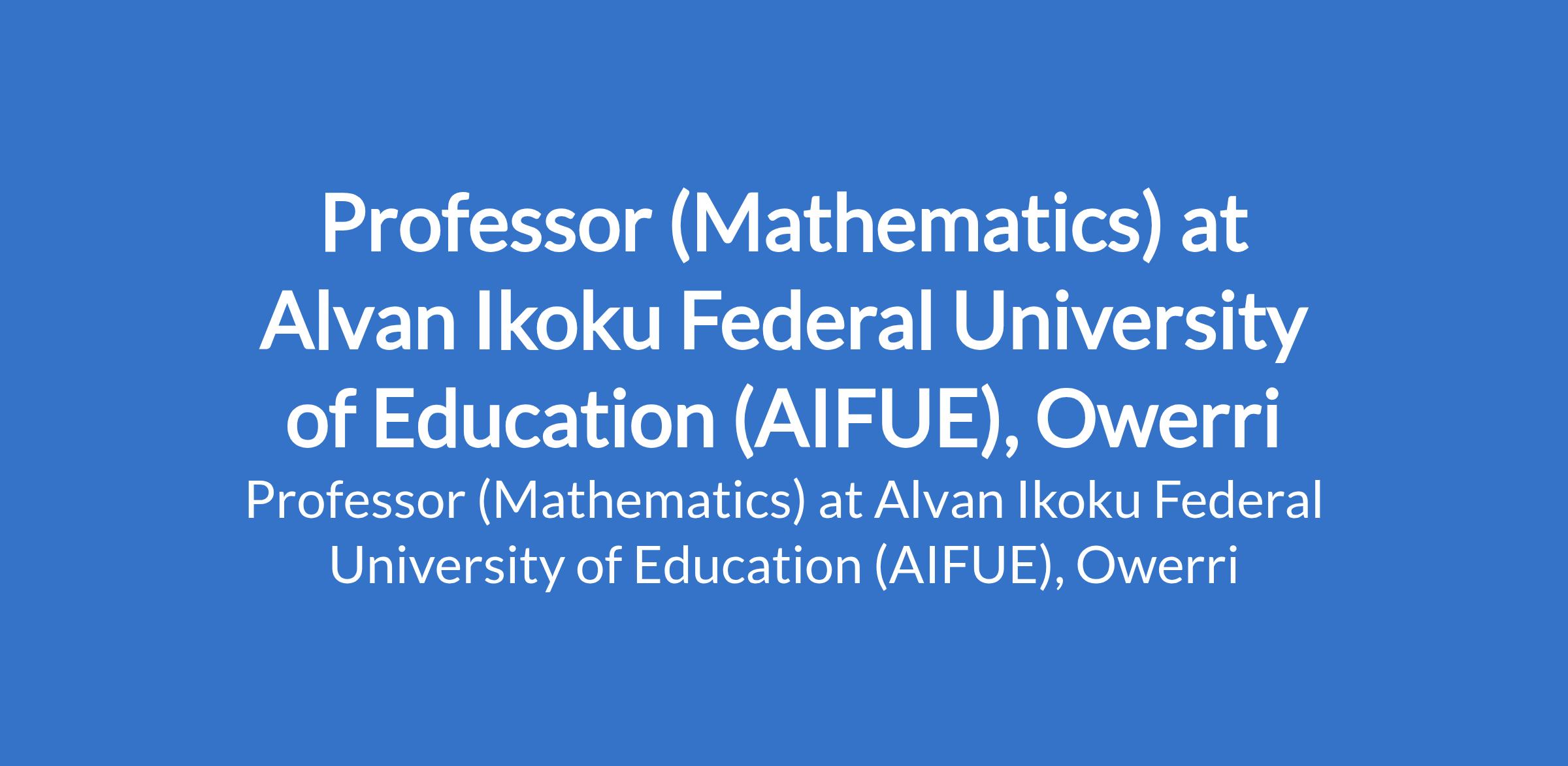 Alvan Ikoku Federal University of Education (AIFUE), Owerri invites applications from suitably qualified candidates for the position of: Professor (Mathematics). The position is located in Imo State. Interested candidates should possess a PhD Degree in the relevant discipline with a minimum of three (3) years as Reader (Associate Professor) and fifteen (15) years of university teaching and research experience.