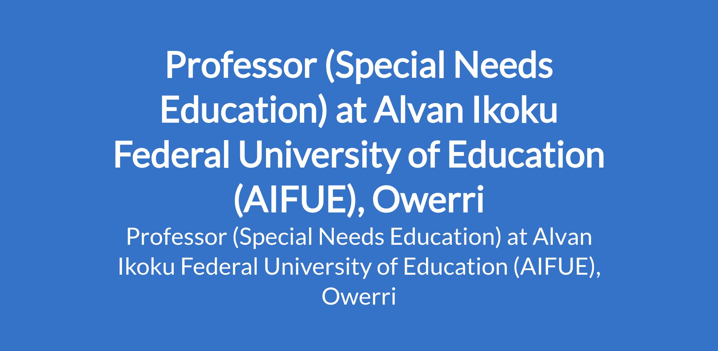 Alvan Ikoku Federal University of Education (AIFUE), Owerri invites applications from suitably qualified candidates for the position of: Professor (Special Needs Education). The position is located in Imo State. Interested candidates should possess a PhD Degree in the relevant discipline with a minimum of three (3) years as Reader (Associate Professor) and fifteen (15) years of university teaching and research experience.