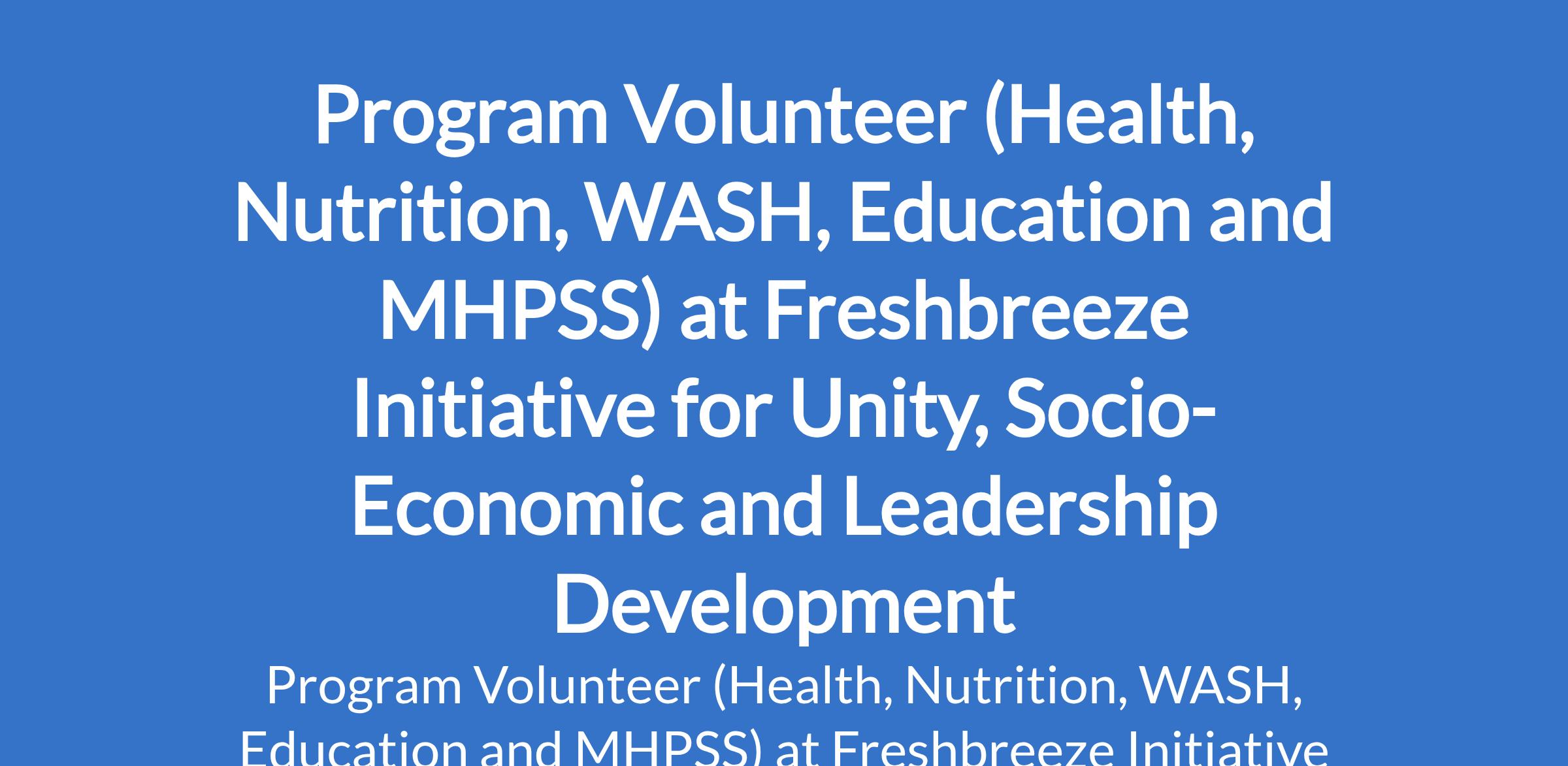 Freshbreeze Initiative for Unity, Socio-Economic and Leadership Development is recruiting to fill the position of: Program Volunteer (Health, Nutrition, WASH, Education and MHPSS). The position is located in Maiduguri, Borno State. Interested candidates should possess an HND / Bachelor`s Degree with 1 - 3 years experience.