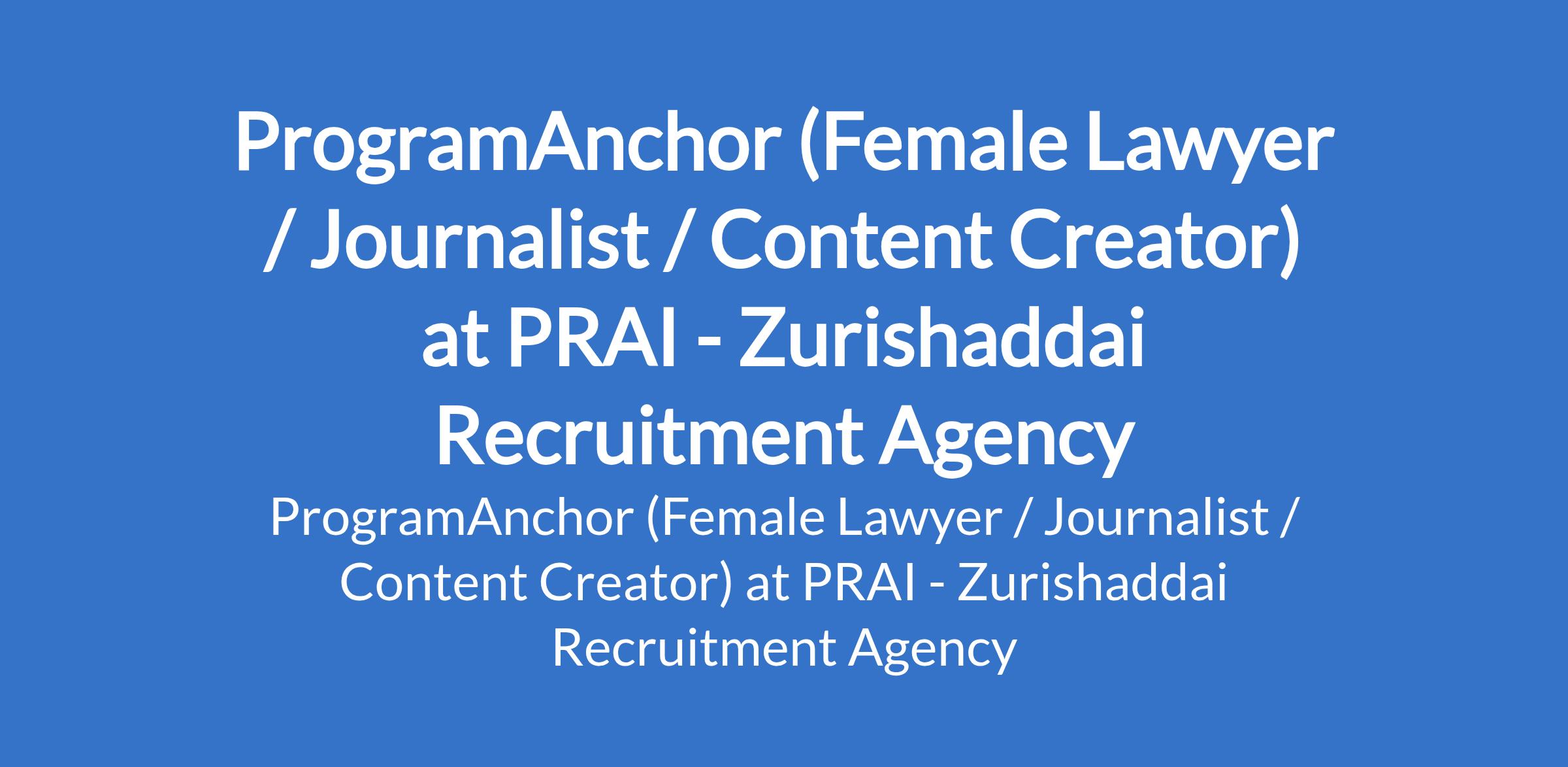 Zurishaddai Recruitment Agency - Our client, PRAI, is recruiting to fill the position of: ProgramAnchor (Female Lawyer / Journalist / Content Creator). The position is located in VGC Lekki, Lagos State. Interested candidates should possess relevant qualifications and work experience.