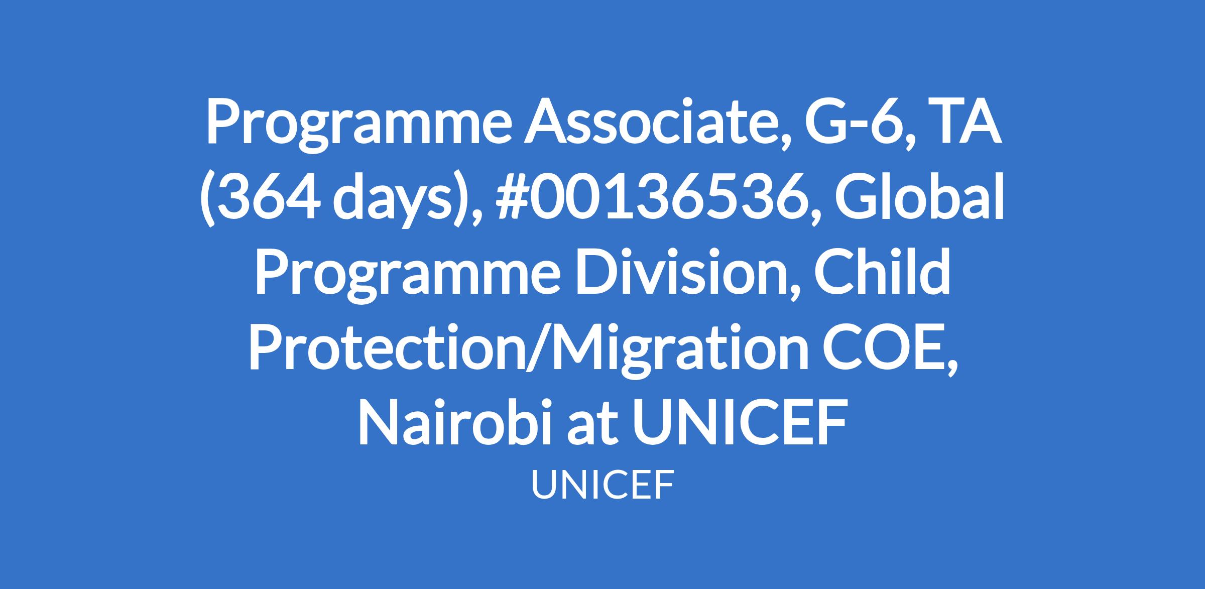 Programme Associate, G-6, TA (364 days), #00136536, Global Programme Division, Child Protection/Migration COE, Nairobi at UNICEF