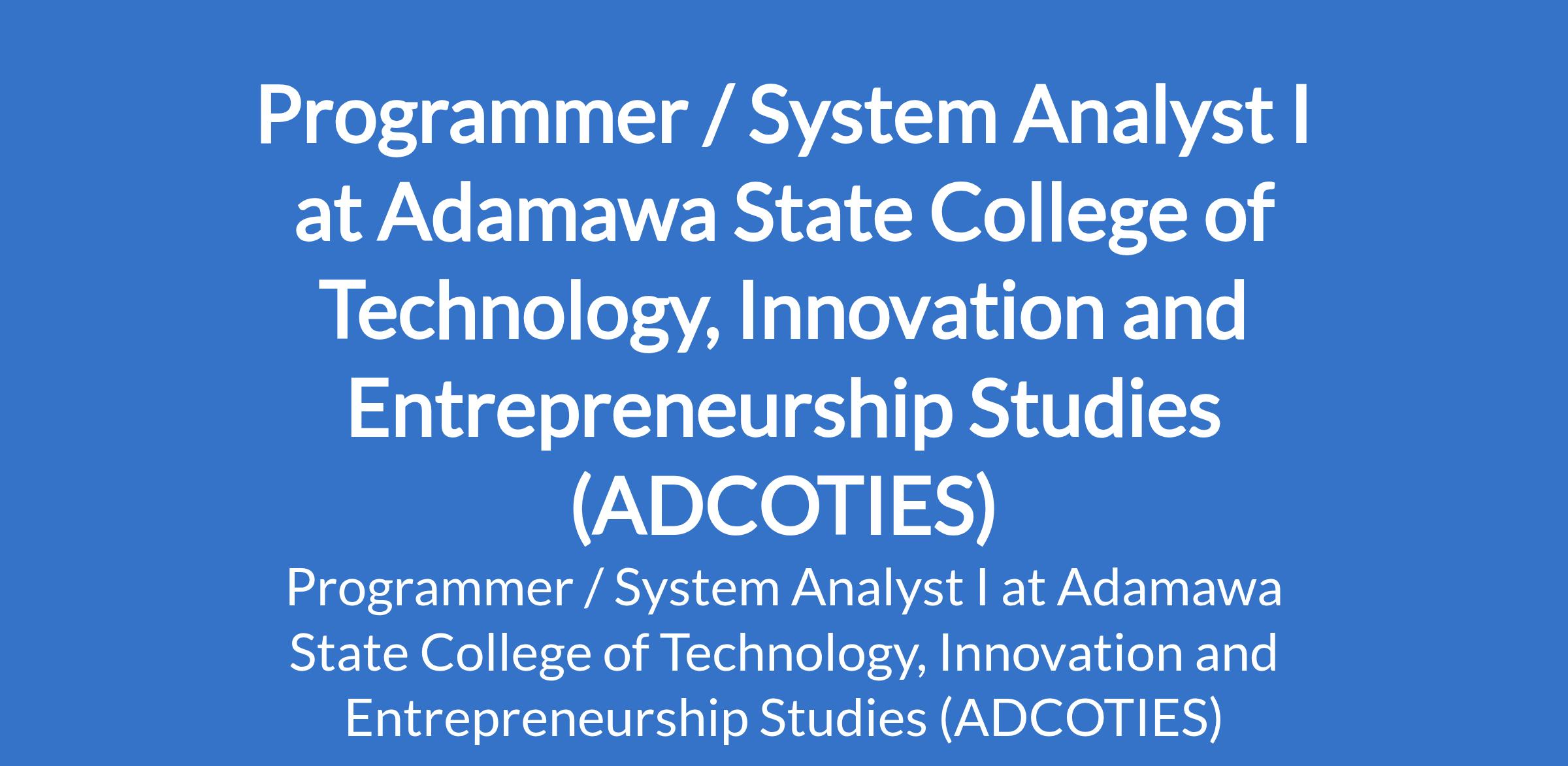 Adamawa State College of Technology, Innovation and Entrepreneurship Studies (ADCOTIES) is recruiting to fill the position of: Programmer / System Analyst I. The position is located in Gulak, Adamawa State. Interested candidates should possess a Bachelor's Degree in relevant discipline with minimum of Second Class Lower with at least 3 years post qualification cognate work experience; or Master's Degree in relevant discipline plus NYSC discharge or exemption certificate.