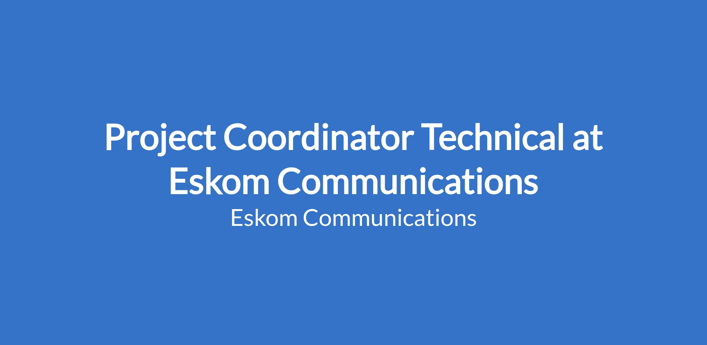 Eskom Distribution is looking for Project Coordinator Technical, Task Grade T12, Department: Strategy and New Business Development, Business Unit: Project Execution, Area of specialization: To provide project management coordination services for Distribution complex projects, thereby ensuring that they are completed safely within agreed timelines, cost and applicable quality standards, Location: Eskom Megawatt Park.