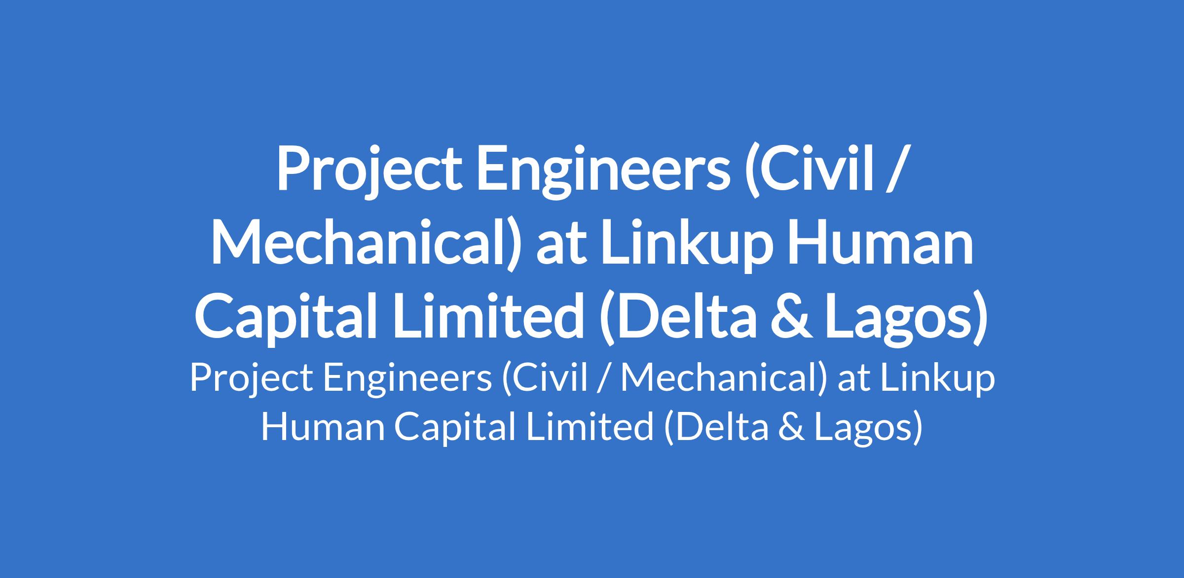 Linkup Human Capital Limited is recruiting to fill the position of: Project Engineer (Civil / Mechanical). The position is located in Delta and Lagos States. Interested candidates should possess a Bachelors Degree in Civil Engineering or Mechanical Engineering with 5-10 years proven field experience in construction, marine, oil & gas, or heavy engineering projects.