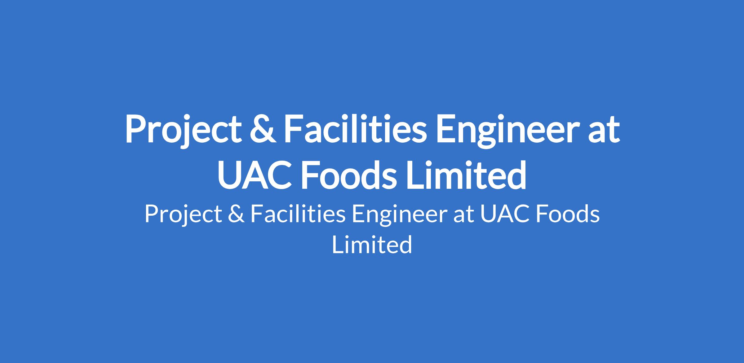 UAC Foods Limited is recruiting to fill the position of: Project & Facilities Engineer. The position is located in Lagos State. Interested candidates should possess an HND or BSc. in Engineering, Facilities Management, or a related field with a minimum of 10 Years + experience in FMCG environment.