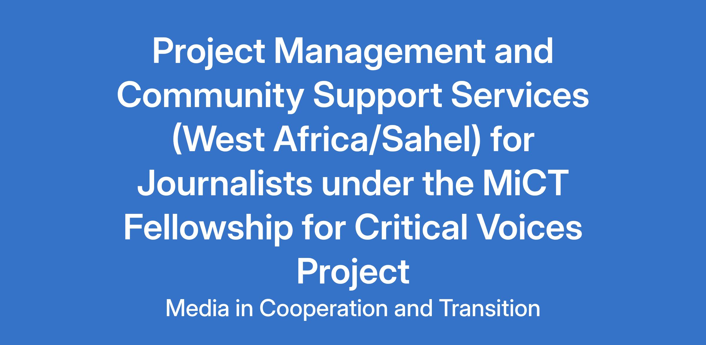 Fellows are afforded financial and health assistance, expert safety guidance, online and in-person training, legal and psycho-social support, production counsel, and entry to a worldwide network of media professionals with shared values. MiCT requires Project Management and Community Support Services in West Africa / Sahel to support journalists seeking safety in West Africa and the Sahel region.