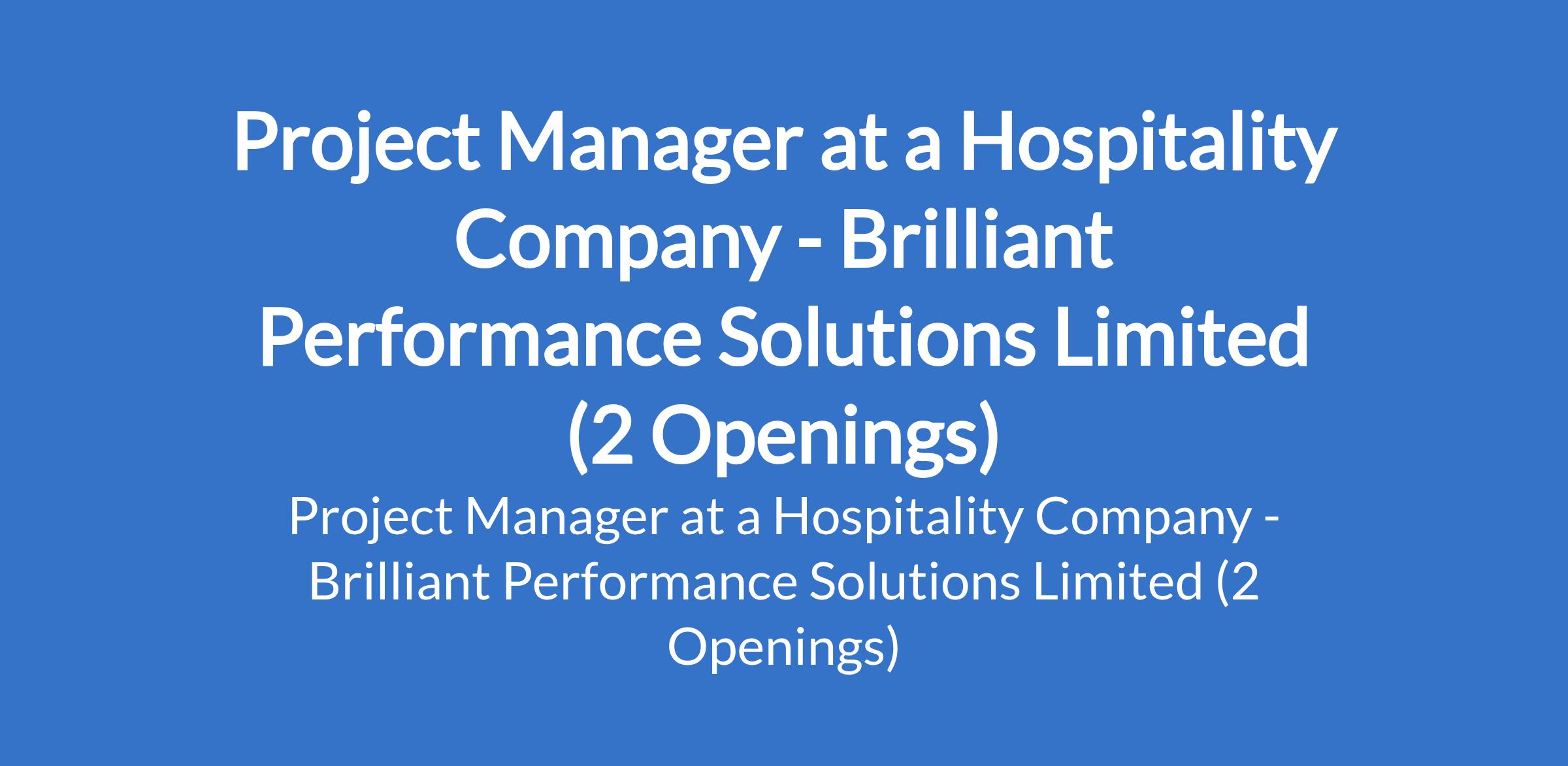 Brilliant Performance Solutions Limited - Our client, a key player in the hospitality Industry is recruiting to fill the position of: Project Manager. The position is located in Island and Mainland, Lagos State. Interested candidates should possess an HND or BSc Degree in a relevant field, and must have a professional certificate preferably PMP, with a minimum of 6 years experience in the hospitality Industry.