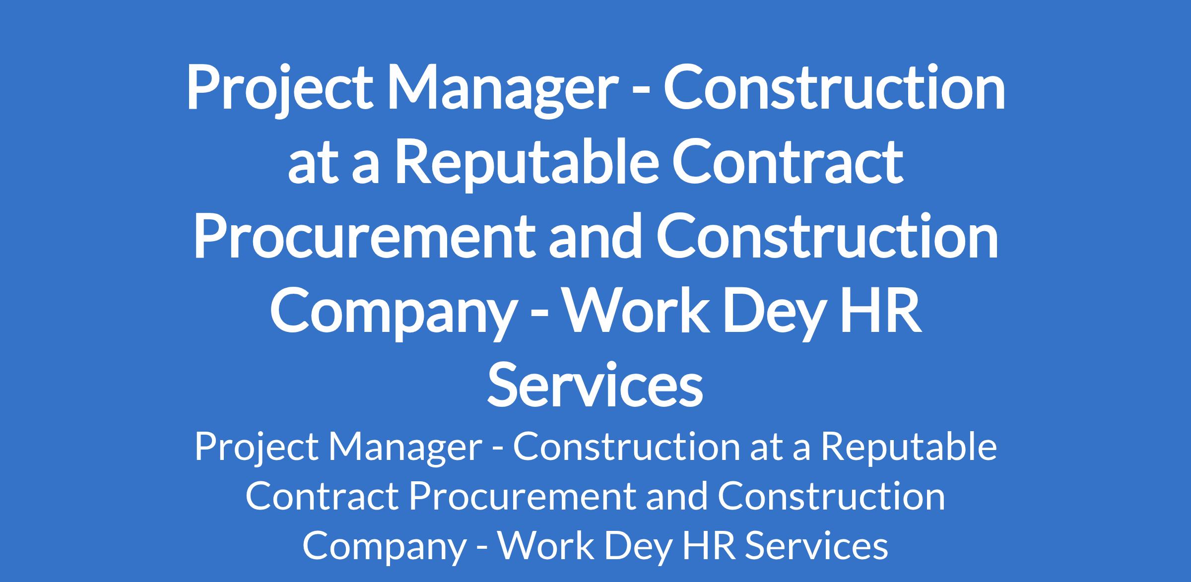 Work Dey HR Services - Our client, a reputable Contract Procurement and Construction Company is recruiting to fill the position of: Project Manager - Construction. The position is located in Abuja (FCT). Salary N200,000 - N250,000 Monthly. Interested candidates should possess a Bachelors Degree in Civil Engineering, Construction Management, or related fields with 57 years proven experience in project management within the construction industry.