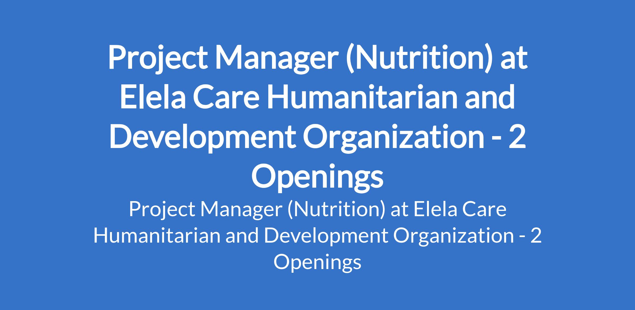Elela Care Humanitarian and Development Organization is recruiting to fill the position of: Project Manager (Nutrition). The position is located in Maiduguri, Borno State. Interested candidates should possess minimum of a Bachelors Degree in Nutrition, Public Health, Community health or other relevant field with a minimum of 5 years work experience in implementing CMAM, IYCF, and other community-based nutrition activities. Experience in MAM treatment using Tom Brown approach