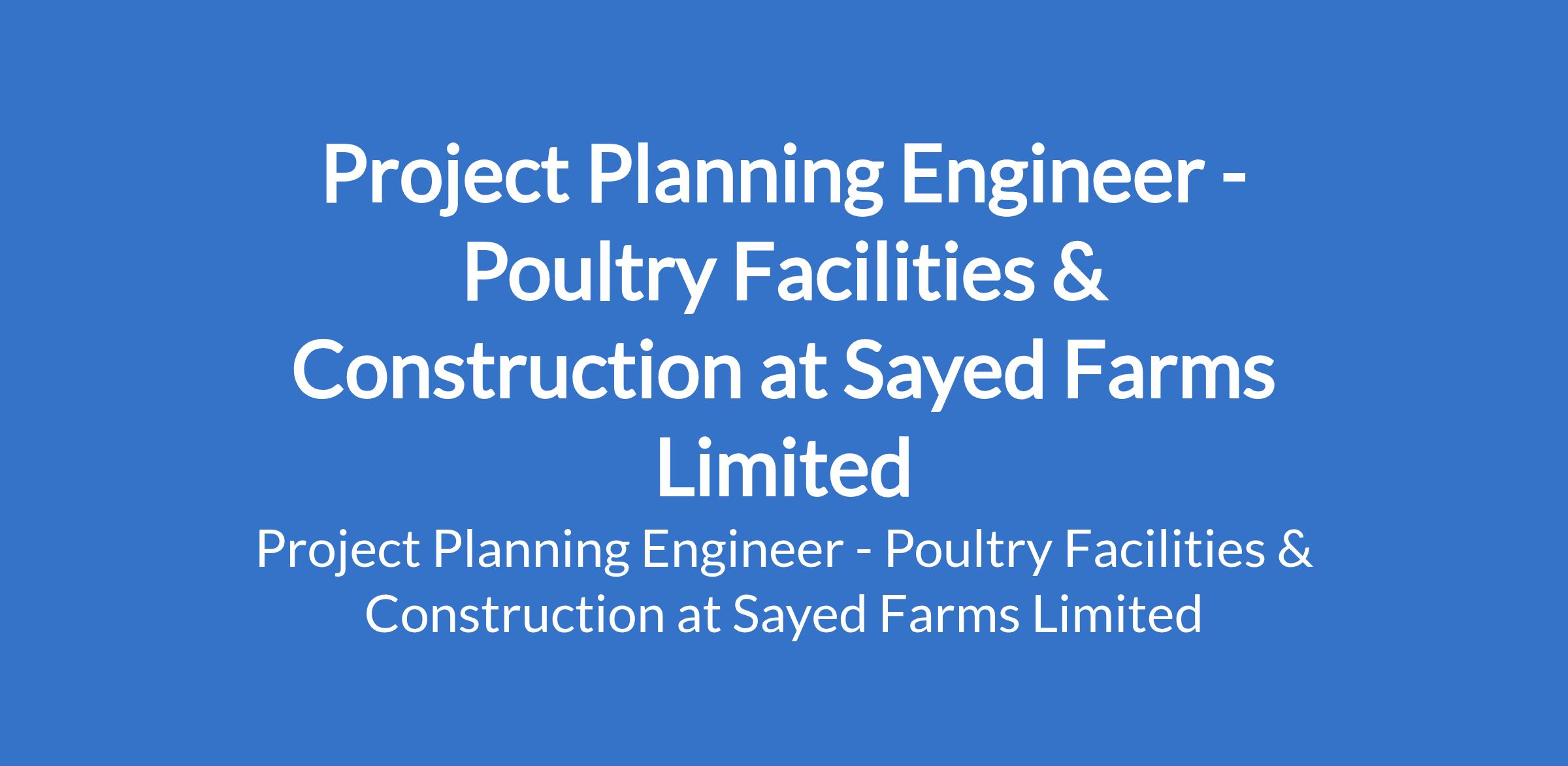 Sayed Farms Limited is recruiting to fill the position of: Project Planning Engineer - Poultry Facilities & Construction. The position is located in Ibadan, Oyo State. Interested candidates should possess a Bachelors Degree in Electrical Engineering, Civil Engineering, Mechanical Engineering, or a related field with a minimum of 5 years experience in project planning and construction.