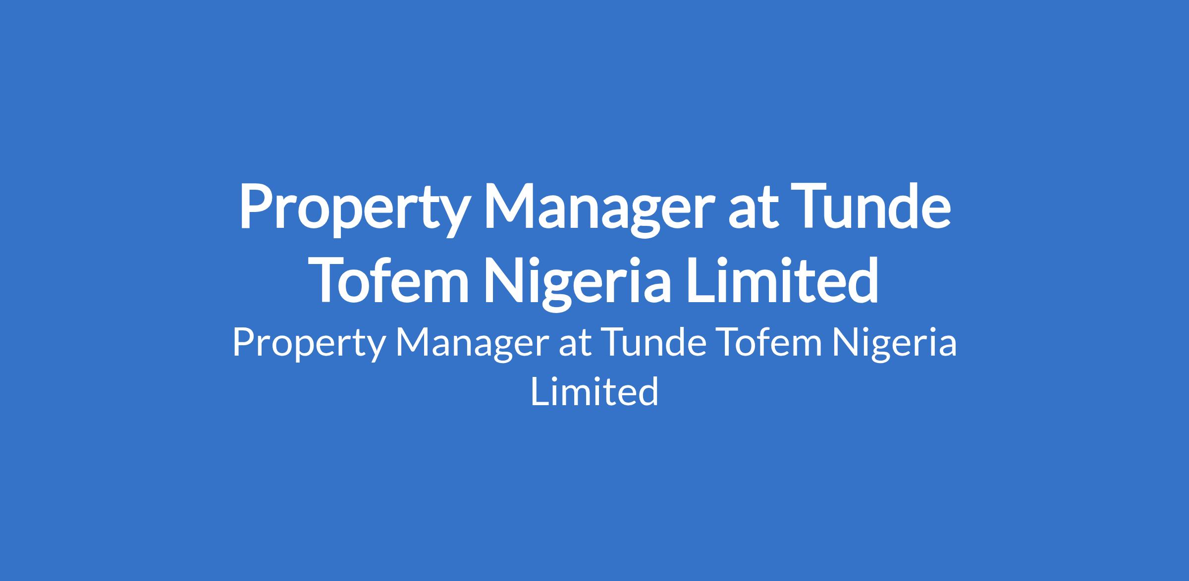 Tunde Tofem Nigeria Limited is recruiting to fill the position of: Property Manager. The position is located in Lagos State. Salary: N150,000 - N200,000 monthly. Interested candidates should possess a Bachelor's Degree with 45 years experience in property management or similar role.