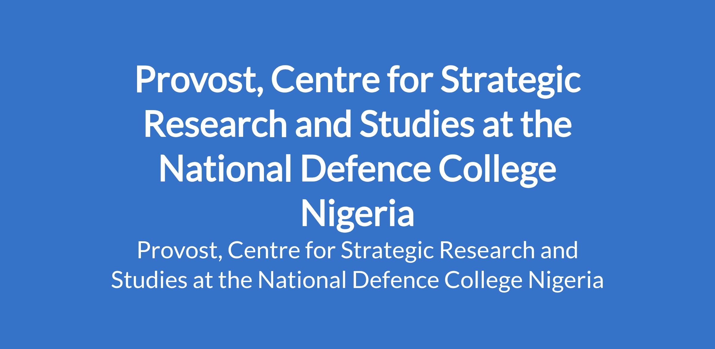 The National Defence College Nigeria invites applications from suitable candidates to fill the position of: Provost, Centre for Strategic Research and Studies. The position is located in Garki, Abuja (FCT). Interested candidates must be a retired Vice Chancellor who is a Professor or a retired Ambassador/retired 2-Star General with a Ph.D Degree and a highly distinguished scholar with not less than ten (10) years working experience in a similar Research Centre or University.