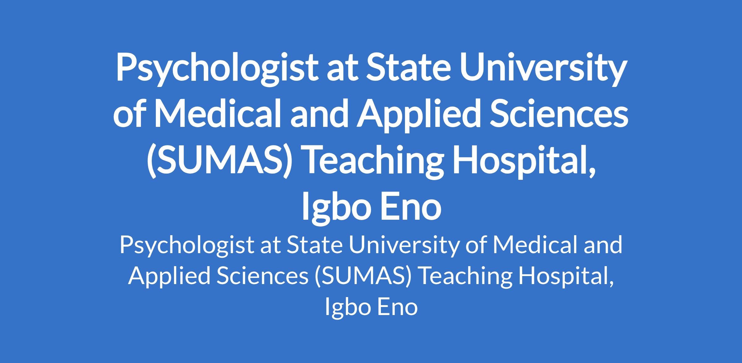 State University of Medical and Applied Sciences (SUMAS) Teaching Hospital, Igbo Eno invites applications from suitable candidates for the position of: Psychologist. The position is located in Enugu State. Interested candidates should possess a Degree / Higher National Diploma in Psychology from a recognized Institution plus National Youth Service Corp Certificate (NYSC) or Exemption certificate.