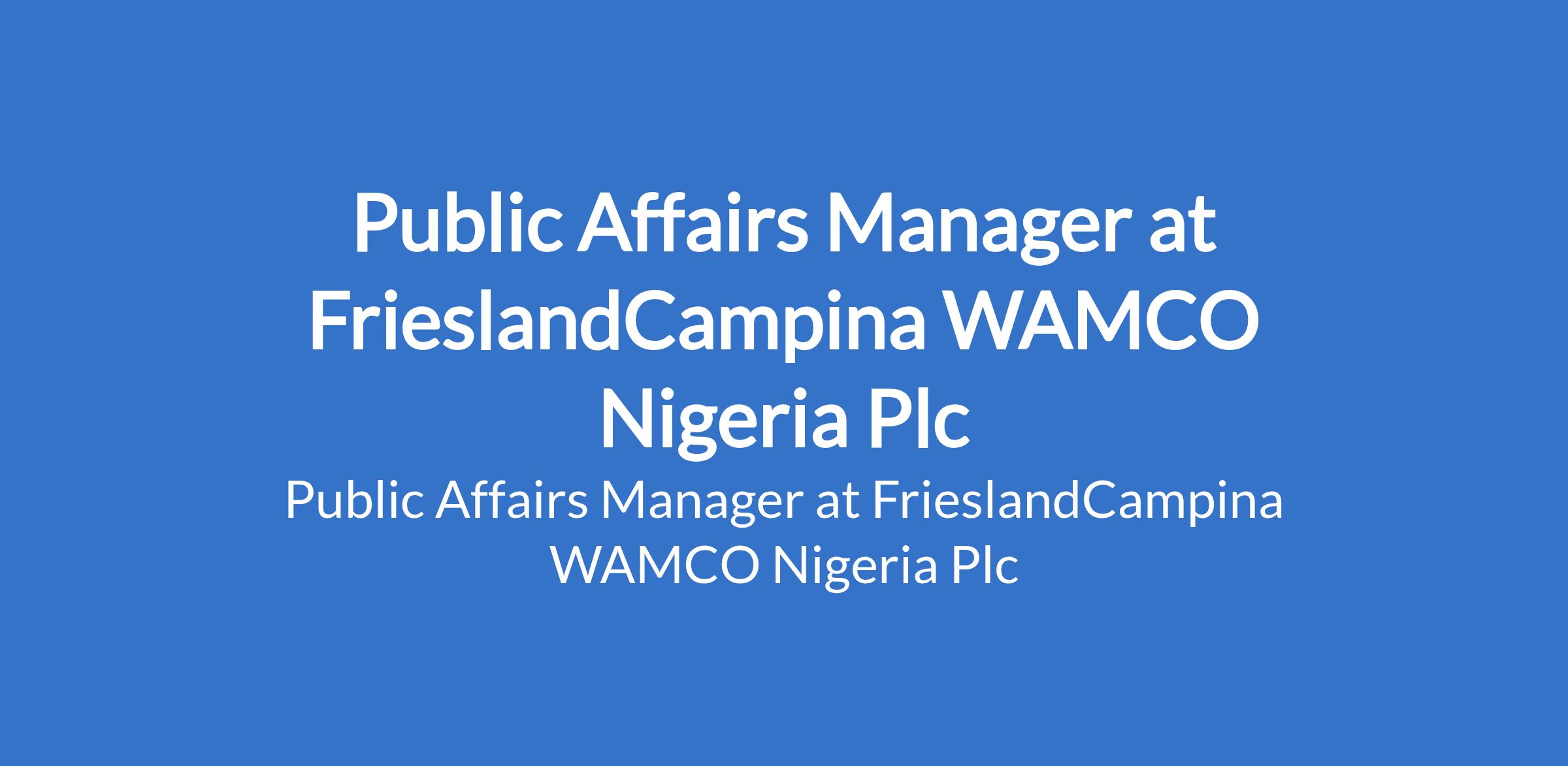FrieslandCampina WAMCO Nigeria Plc is recruiting to fill the position of: Public Affairs Manager. Interested candidates should possess a First Degree in any discipline MBA/MSC with 10+ years experience in strategic public Affairs and communications roles.
