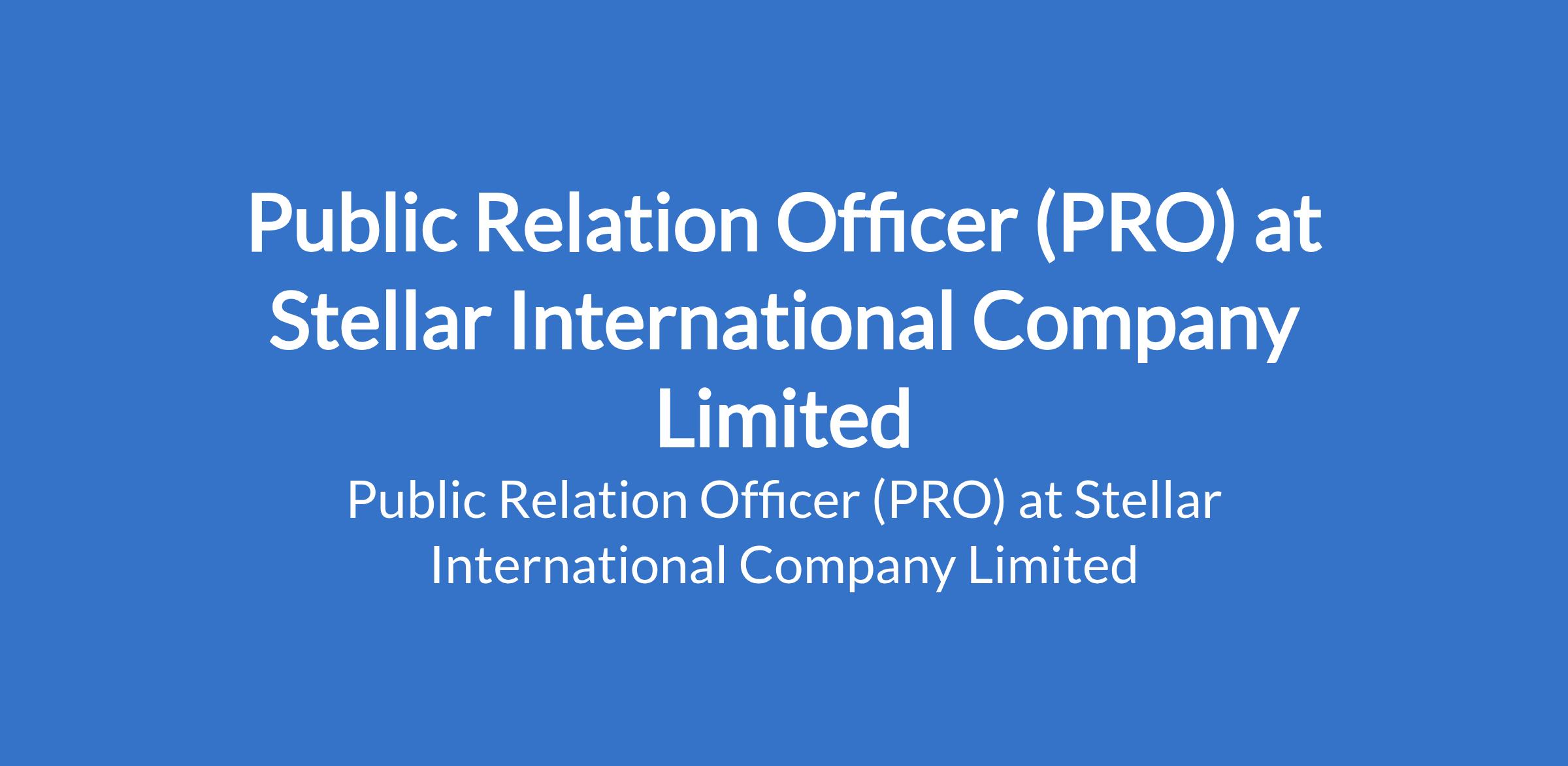 Stellar International Company Limited is recruiting to fill the position of: Public Relation Officer (PRO). The position is located in Abuja (FCT). Interested candidates should possess a Bachelor's Degree or above in Secretary, Business Administration, Marketing, Public Relations, International Business is preferred with 3-8 years experience.