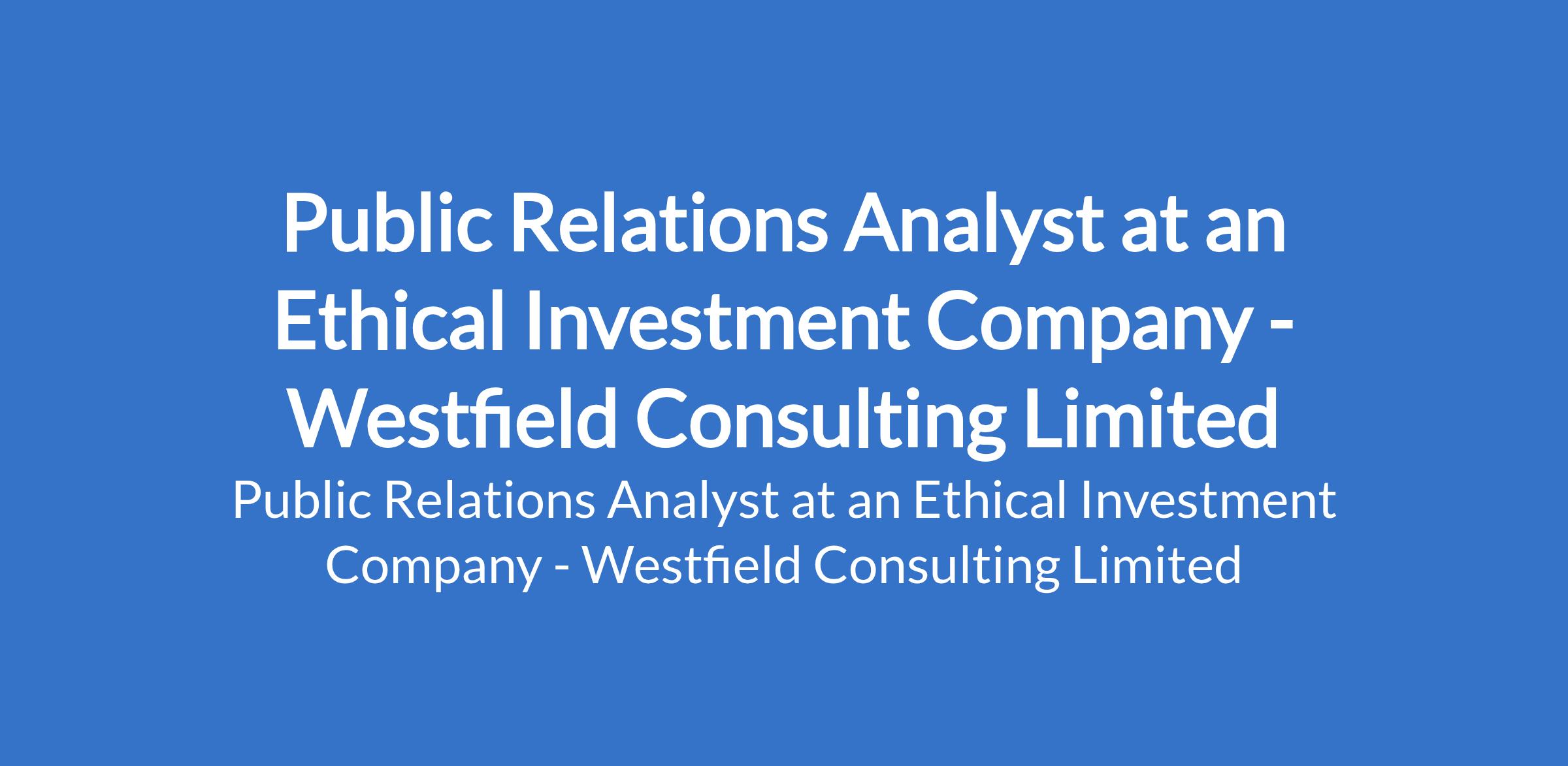 Westfield Consulting Limited - Our client, an ethical Investment company is recruiting to fill the position of: Public Relations Analyst. The position is located in Lagos State. Interested candidates should possess a Bachelors Degree or its equivalent in Mass Communication, English and related areas of study with a minimum of 2 years work experience in similar role.