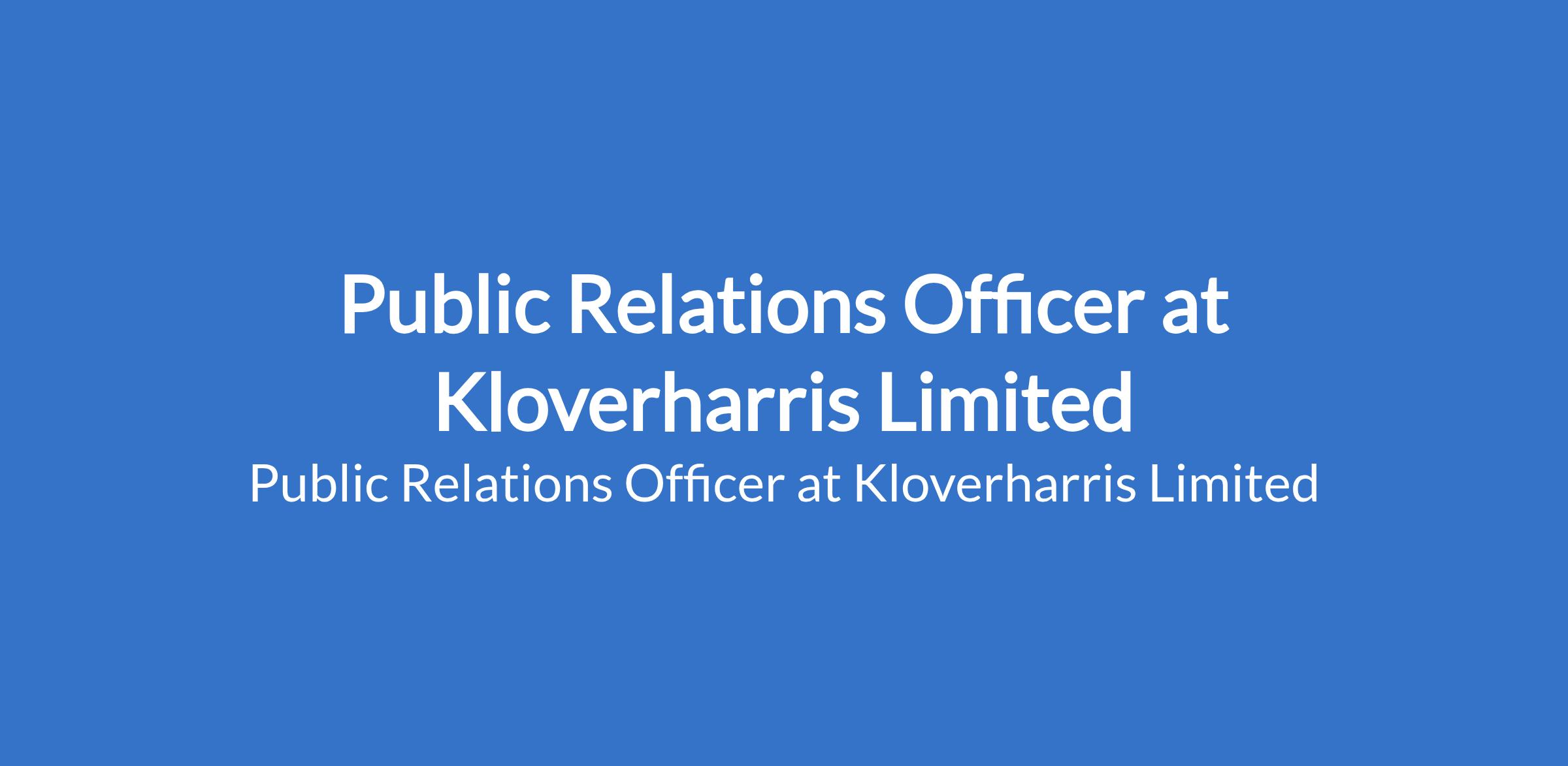 Kloverharris Limited is recruiting to fill the position of: Public Relations Officer. The position is located in Victoria Island, Lagos State. Salary: N800,000 - N1,400,000 / month. Interested candidates should possess relevant qualifications with a minimum of 10 years experience in public relations, corporate communications, or media.
