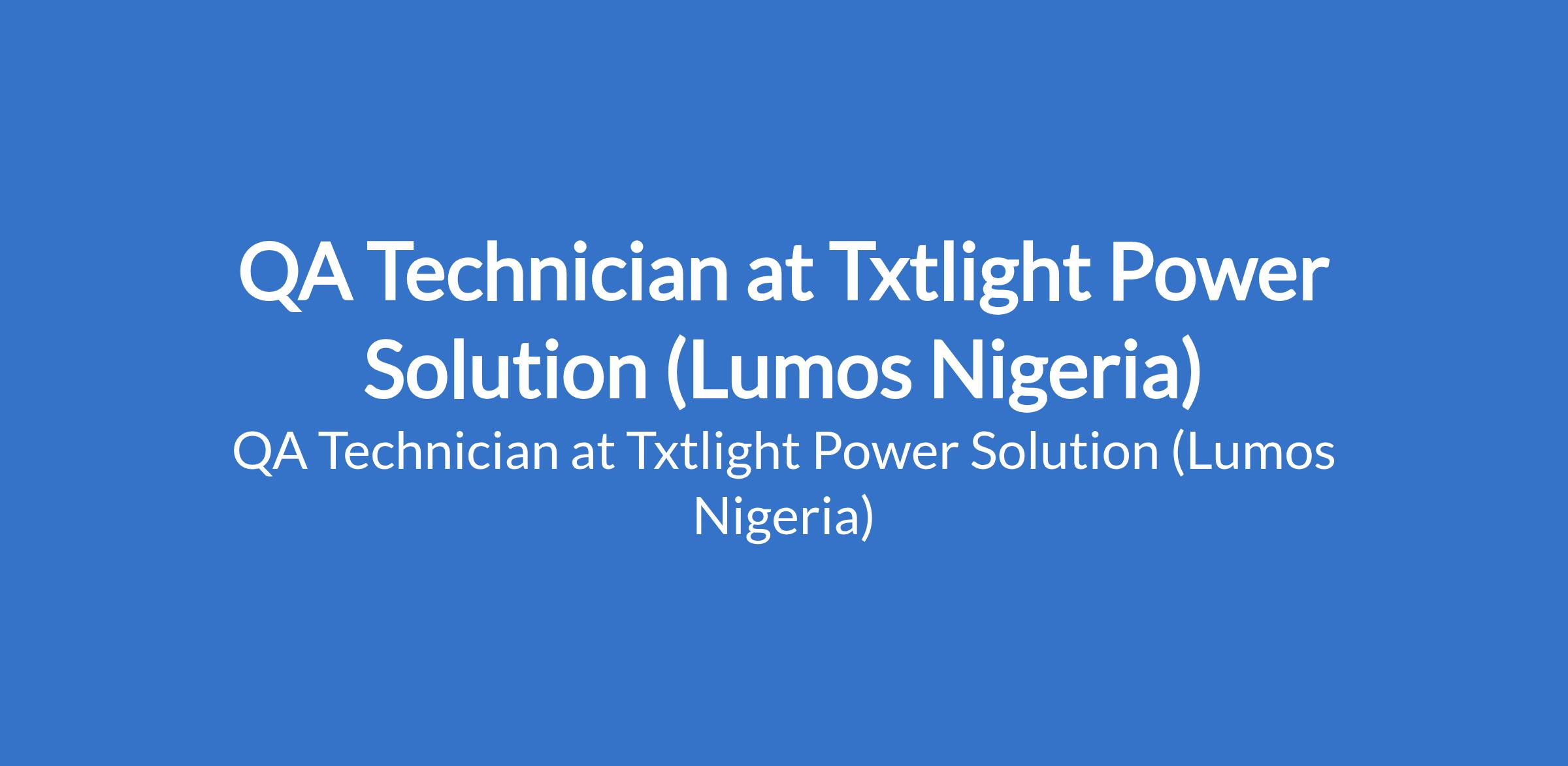 Txtlight Power Solution (Lumos Nigeria) is recruiting to fill the position of: QA Technician. The position is located in Sanya, Lagos State. Interested candidates should possess a Diploma / HND / B.Sc. in Electrical Engineering, Electronics Engineering, or related fields with 13 years experience in solar, power electronics, or inverter systems testing.