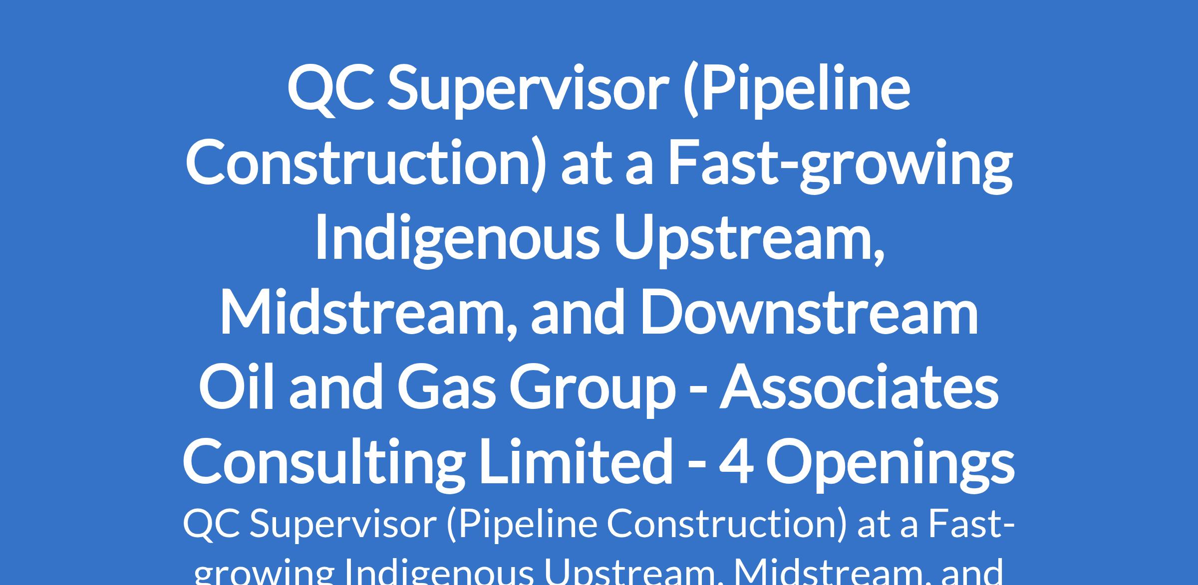 Associates Consulting Limited - Our client is a fast-growing indigenous upstream, midstream, and downstream oil and gas group is recruiting to fill the position of: QC Supervisor (Pipeline Construction). The position is located in Akwa Ibom, Delta, Imo, and Rivers States. Interested candidates should possess a Degree/HND in Mechanical Engineering or related course with 8 - 10 years quality control (QC) experience especially in gas/crude pipeline projects.