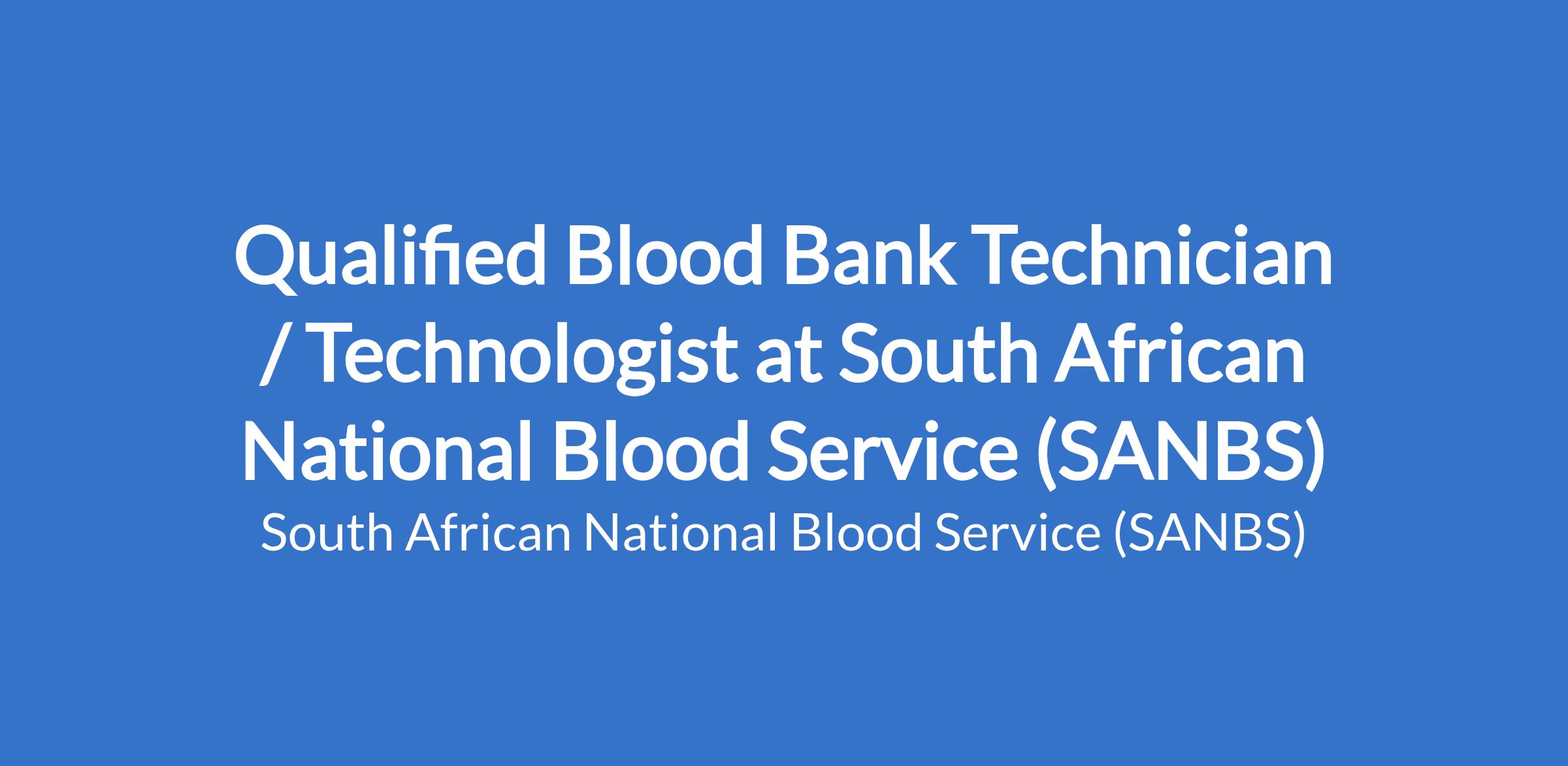 Qualified Blood Bank Technician To perform routine testing functions (manual and automated) in blood banks including but not limited to, compatibility, post-natal and preliminary transfusion reaction investigations according to Standard Operating Procedures and the Standards of Practice for Blood Transfusion in South Africa.