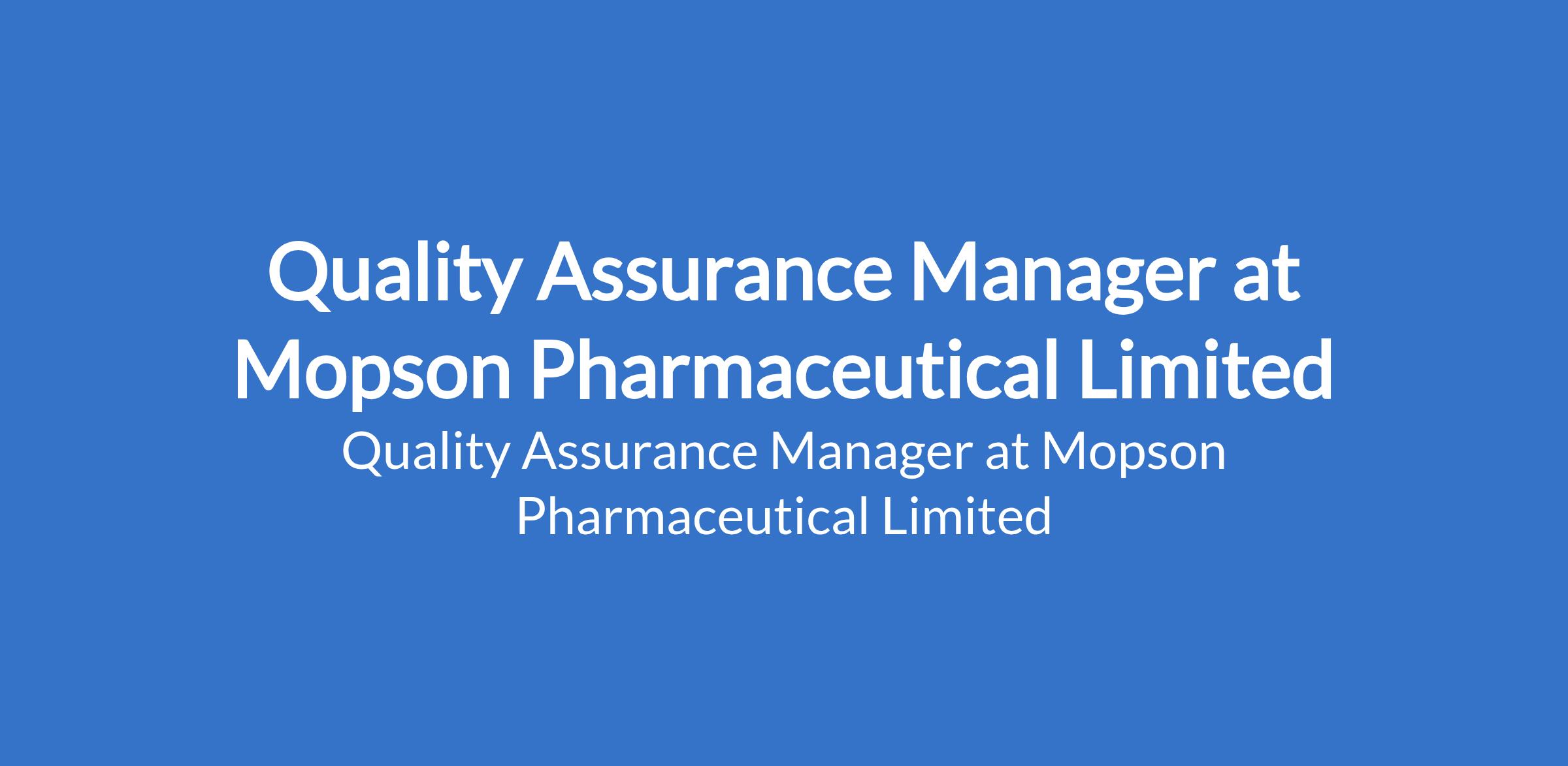 Mopson Pharmaceutical Limited is recruiting to fill the position of: Quality Assurance Manager. The position is located in Lagos State. Interested candidates should possess a Bachelor's Degree in Quality, Social Sciences with 3 - 5 years of relevant work experience and certification in Risk Management, Accounting and Quality Systems.
