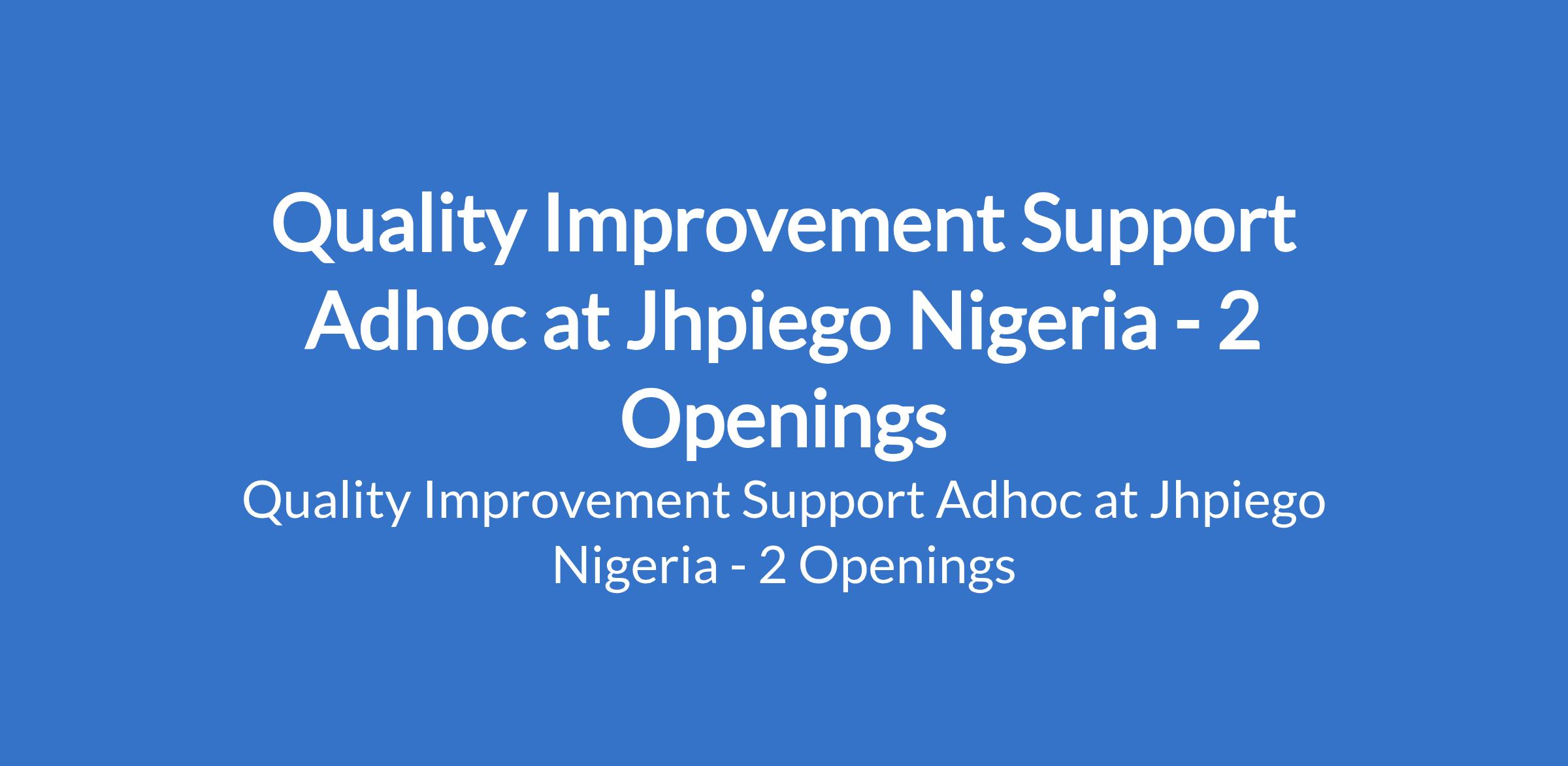 Jhpiego Nigeria is recruiting to fill the position of: Quality Improvement Support Adhoc. The position is located in Gombe and Jigawa States. Interested candidates should possess a Diploma or Degree in a health-related field (e.g., Nursing, Midwifery, Public Health, Community Health) with 24 years experience in health service delivery or public health programs.