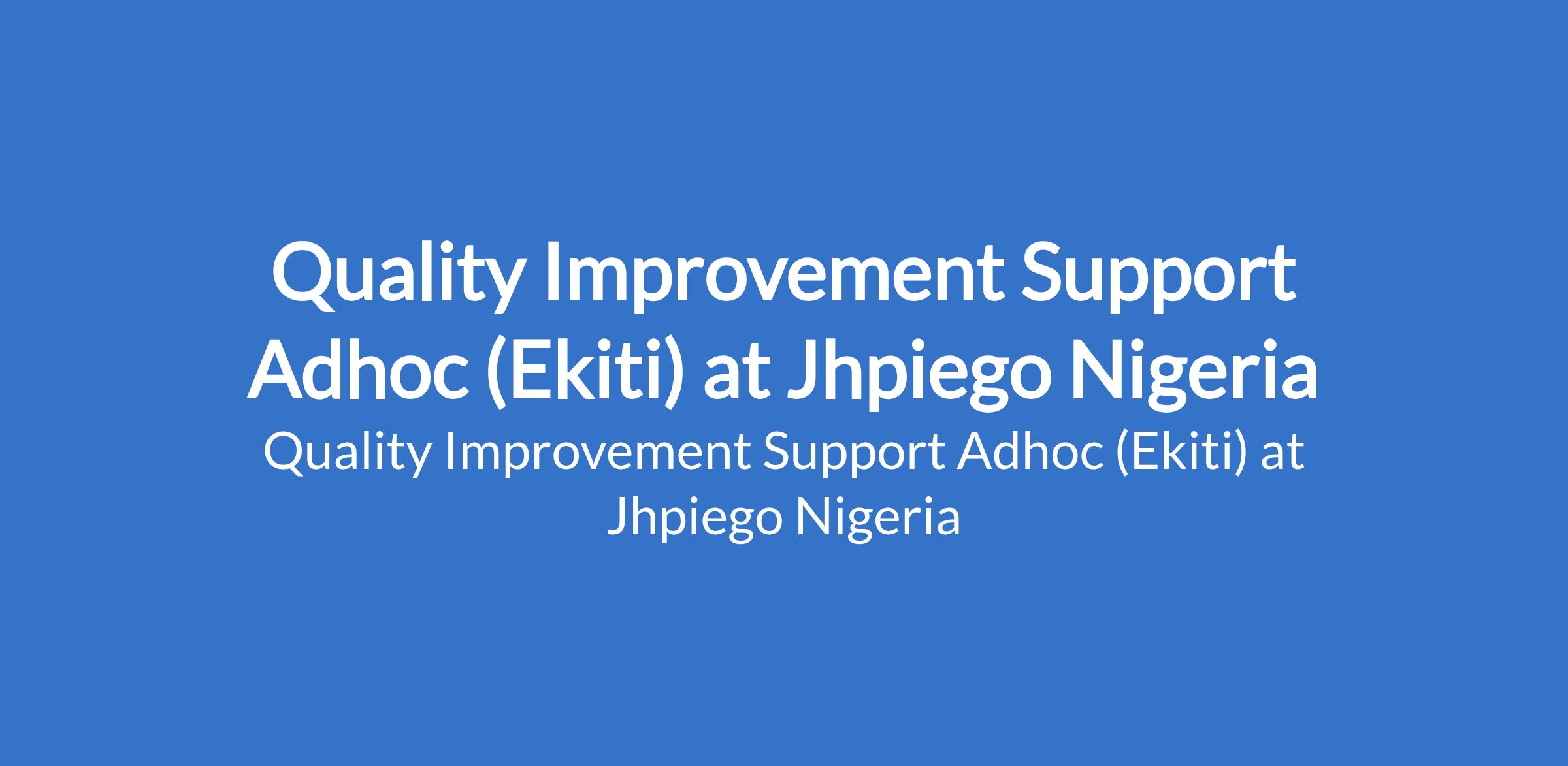 Jhpiego Nigeria is recruiting to fill the position of: Quality Improvement Support Adhoc. The position is located in Ado - Ekiti, Ekiti State. Interested candidates should possess a Diploma or Degree in a health-related field (e.g., Nursing, Midwifery, Public Health, Community Health) with 24 years experience in health service delivery or public health programs.