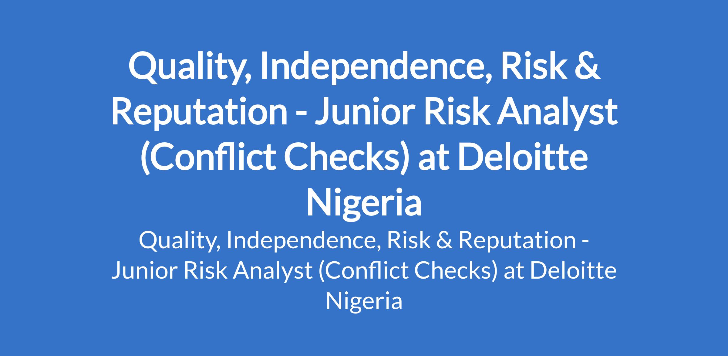 Deloitte Nigeria is recruiting to fill the position of: Quality, Independence, Risk & Reputation - Junior Risk Analyst (Conflict Checks). The position is located in Eti-Osa, Lagos State. Interested candidates should possess a Bachelors Degree (B.A., B.Eng. / B. Tech., etc) or Higher National Diploma (HND) in any relevant discipline with a minimum of Second Class Lower/Lower Credit division, a minimum of credit in five WASSCE/GCE/NECO Ordinary Level subjects or acceptable equivalent examination, including Mathematics and English Language in one sitting only, with a minimum of 2 years experience within relevant function/area.