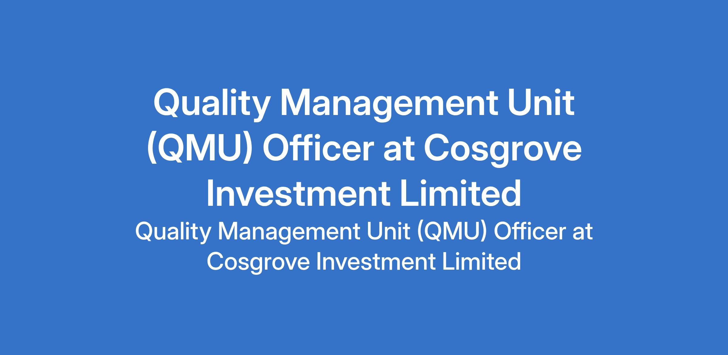 Cosgrove Investment Limited is recruiting to fill the position of: Quality Management Unit (QMU) Officer. The position is located in Abuja. Interested candidates should possess a B.Sc Degree / HND in Engineering, Construction Management, or related field with a minimum of 5 years proven experience in Quality Management or related role.
