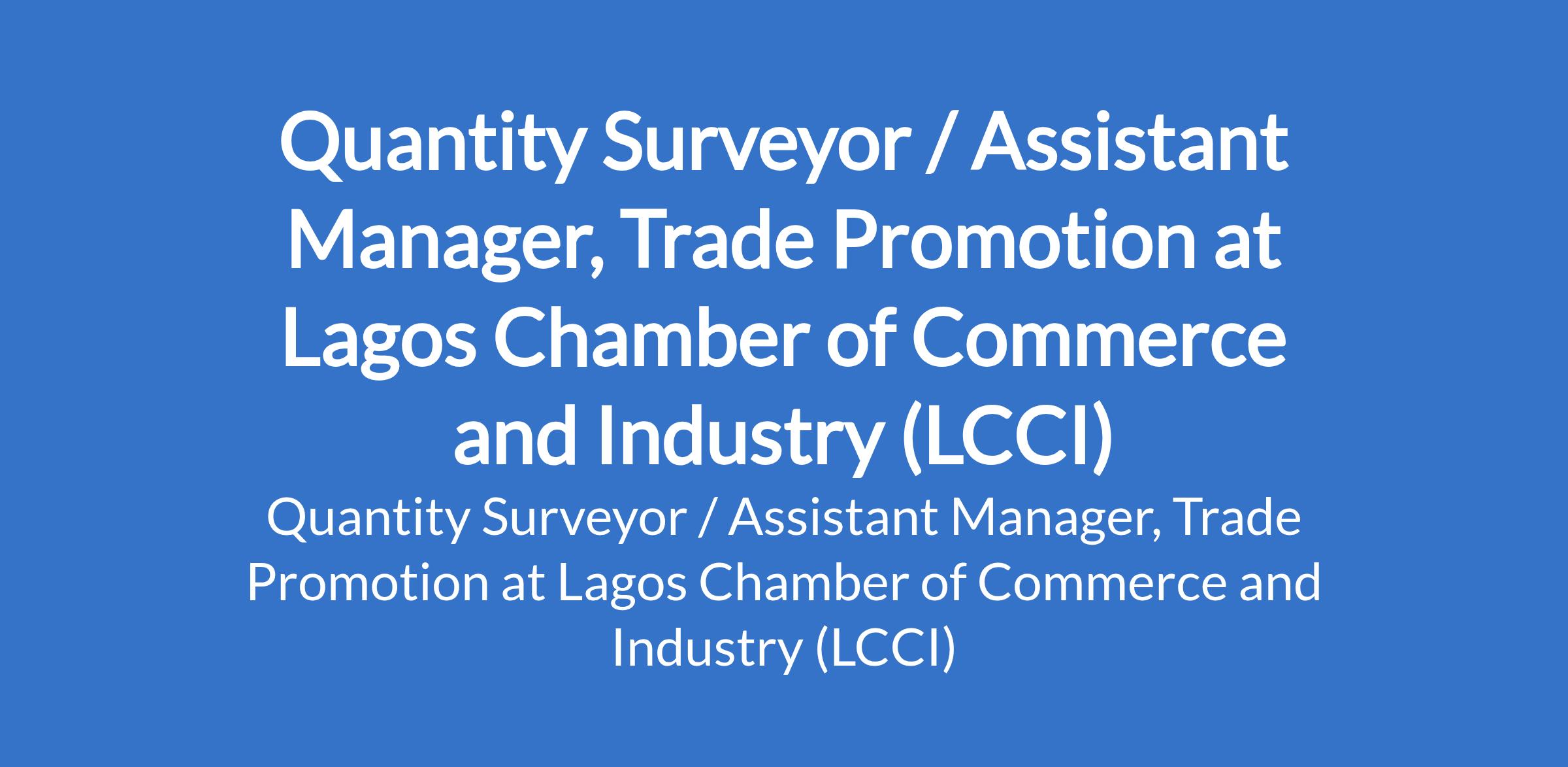 Lagos Chamber of Commerce and Industry (LCCI) is recruiting to fill the position of: Quantity Surveyor / Assistant Manager, Trade Promotion. The position is located in Lagos State. Interested candidates should possess an HND or Bachelors Degree in Quantity Surveying, Construction Management, or a related field with a minimum of 5 years relevant experience in quantity surveying or similar roles