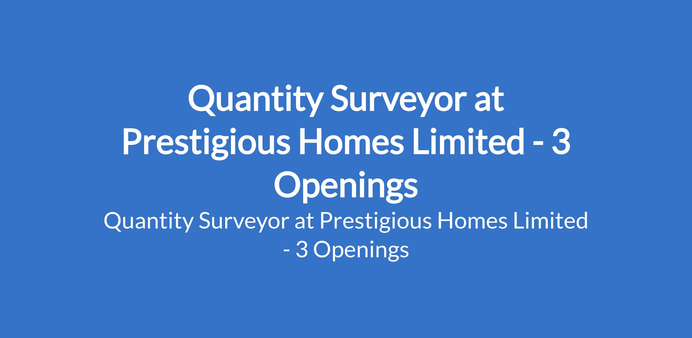 Prestigious Homes Limited is recruiting to fill the position of: Quantity Surveyor. The position is located in Lekki, Ikoyi, Victoria Island - Lagos State. Interested candidates should possess HND / B.S.c in Quantity Surveying with 68 years relevant experience.