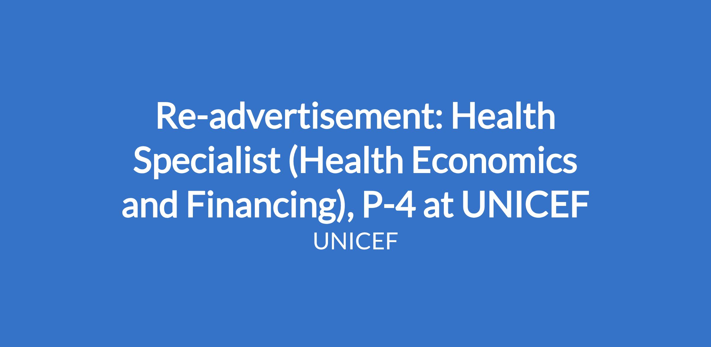 Re-advertisement: Health Specialist (Health Economics and Financing), P-4 at UNICEF