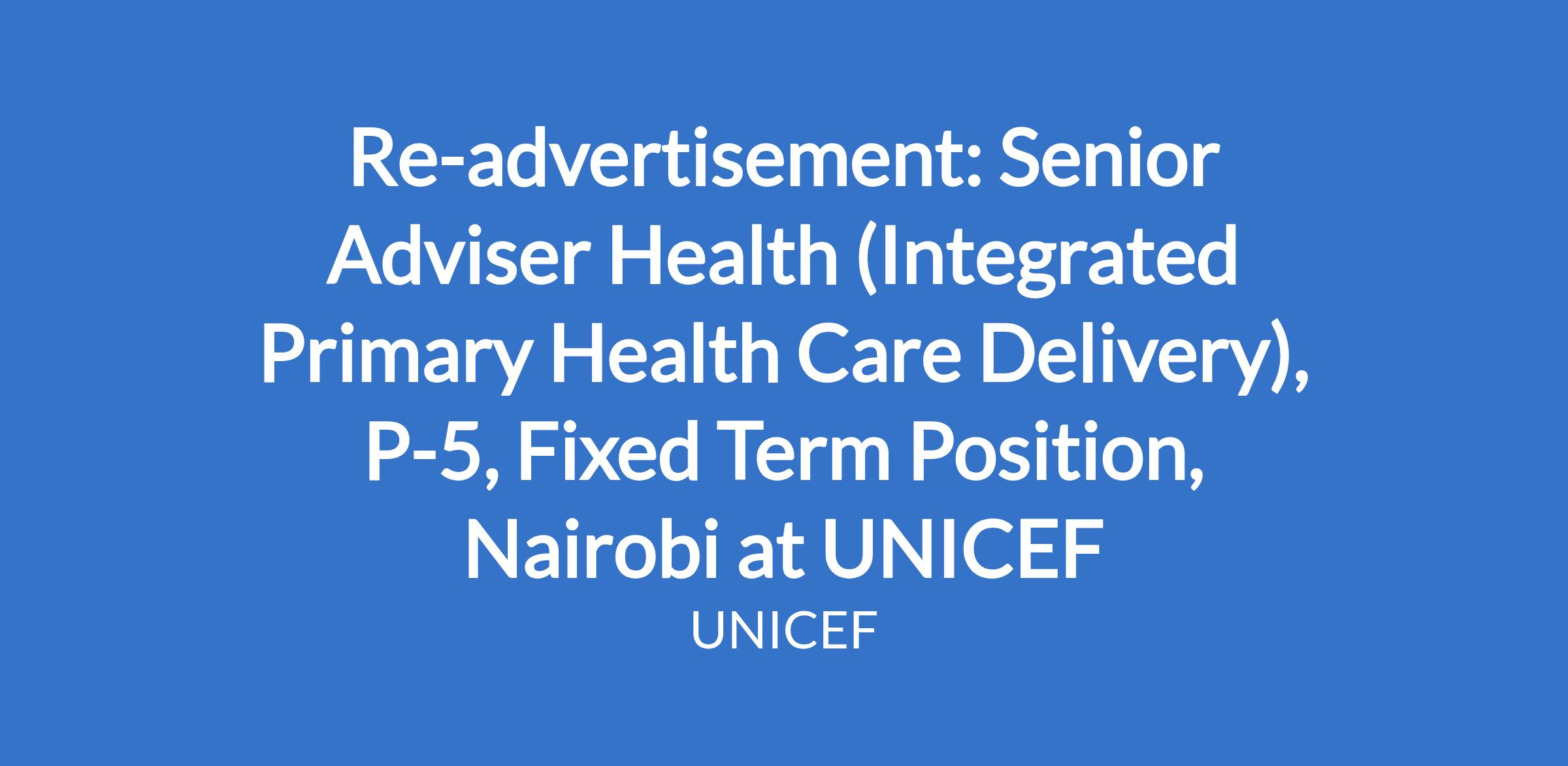 Re-advertisement: Senior Adviser Health (Integrated Primary Health Care Delivery), P-5, Fixed Term Position, Nairobi at UNICEF