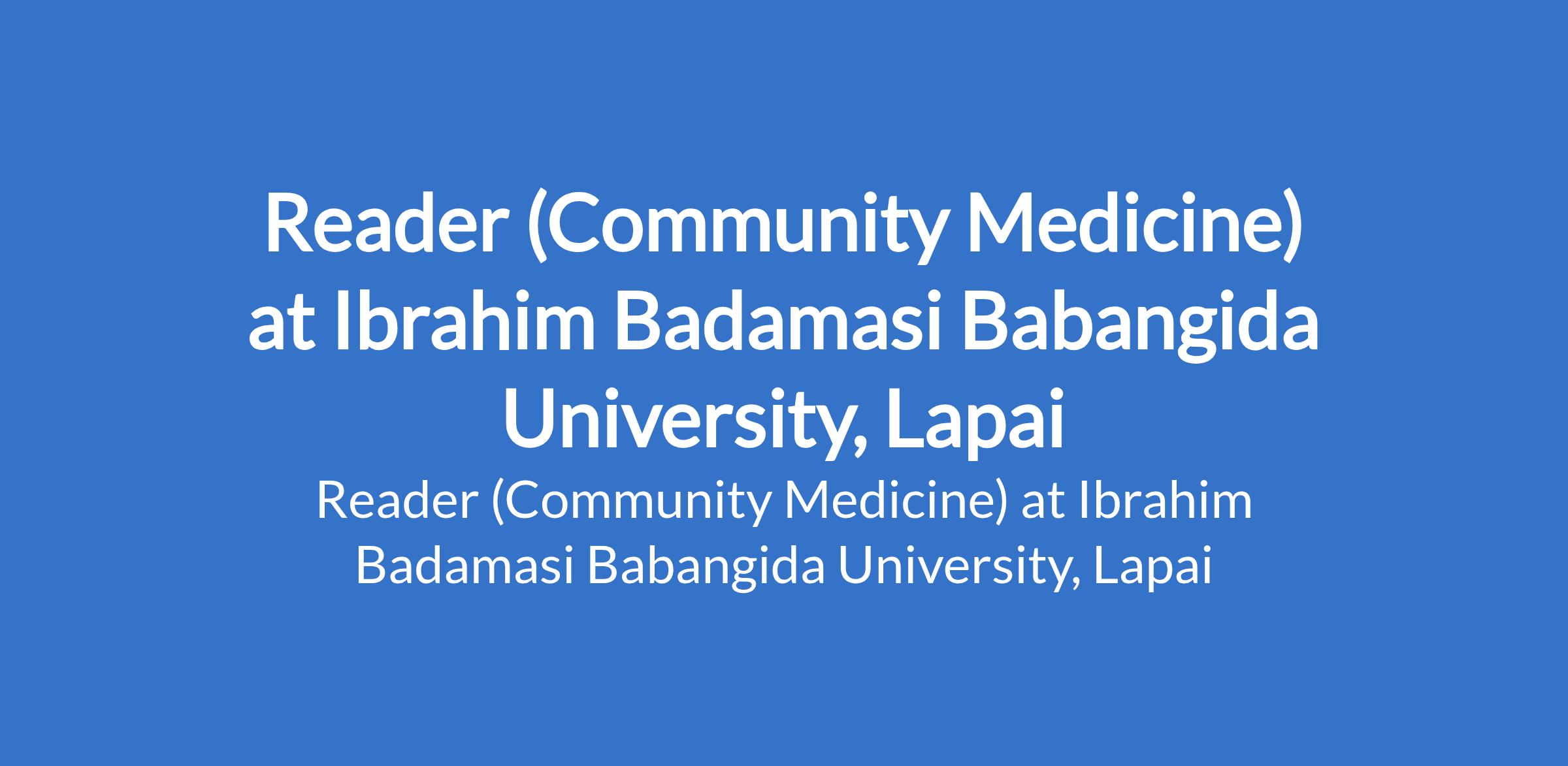 Ibrahim Badamasi Babangida University, Lapai invites applications from suitably qualified candidates to fill the position of: Reader (Community Medicine). The position is located in Niger State. Interested candidates should be holders of MBBS Degree from recognized Universities with PhD, Fellowship of the National Postgraduate Medical College of Nigeria or its equivalent in the relevant specialty/sub specialty with at least twelve (12) years teaching, research and administrative experience in a tertiary institution. institution.