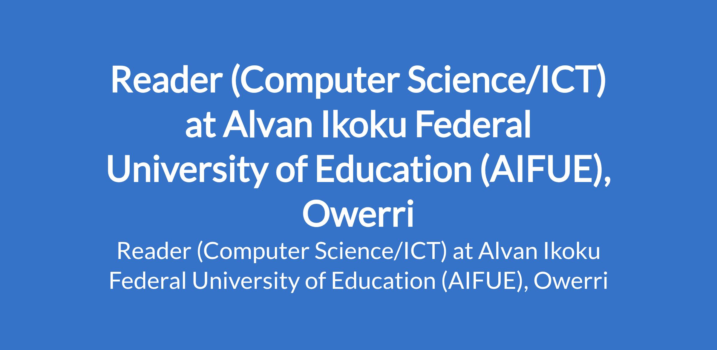 Alvan Ikoku Federal University of Education (AIFUE), Owerri invites applications from suitably qualified candidates for the position of: Reader (Computer Science/ICT). The position is located in Imo State. Interested candidates should possess a PhD Degree with not less than twelve (12) years of university teaching/research experience and a minimum of three (3) years as Senior Lecturer.