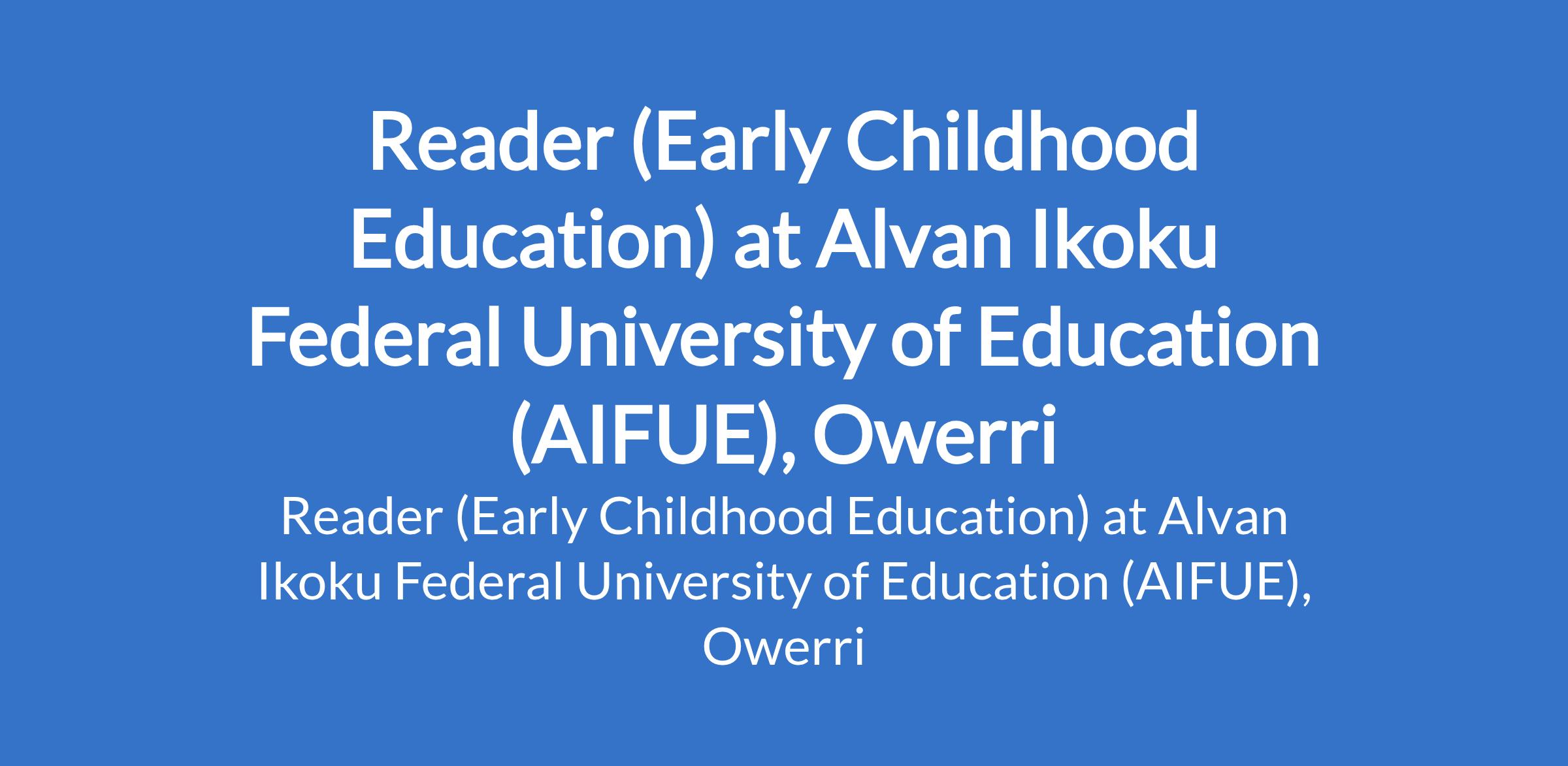 Alvan Ikoku Federal University of Education (AIFUE), Owerri invites applications from suitably qualified candidates for the position of: Reader (Early Childhood Education). The position is located in Imo State. Interested candidates should possess a PhD Degree with not less than twelve (12) years of university teaching/research experience and a minimum of three (3) years as Senior Lecturer.