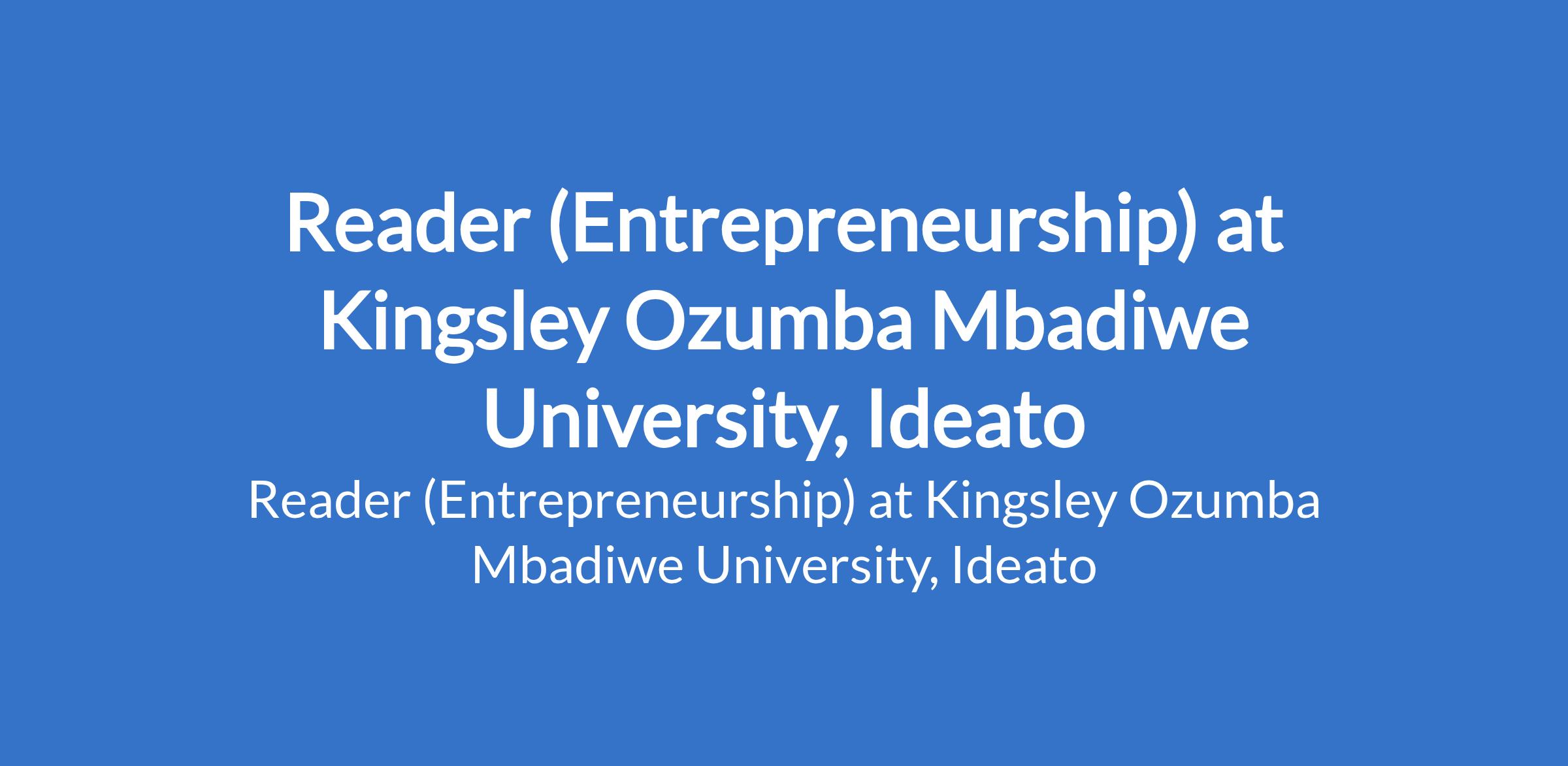 Kingsley Ozumba Mbadiwe University, Ideato invites applications for the position of: Reader (Entrepreneurship). The position is located in Imo State. Interested candidates should possess a Doctorate Degree in the relevant field with a minimum of ten (10) years post qualification experience in teaching and research in a university.